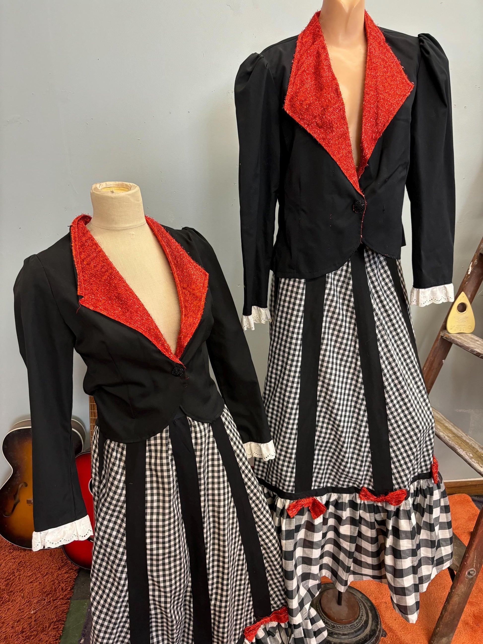 vtg 70s TWINS HALLOWEEN COSTUME / vintage red lurex vampire tuxedo plaid bow tie maxi skirt sets day of the dead celebratory costume theater
