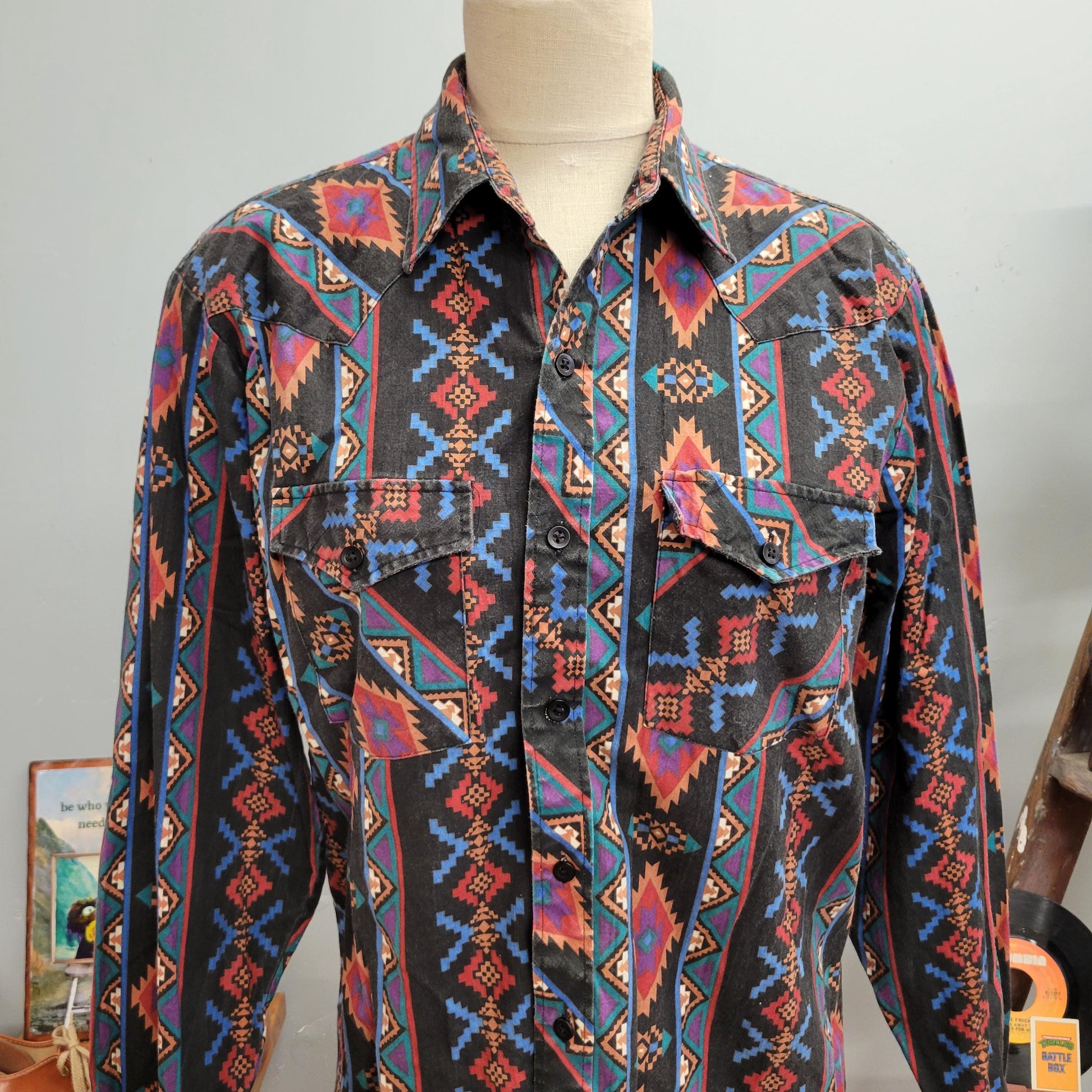 vtg 70s WESTERN BUTTON DOWN // vintage authentic western youngbloods shirt medium cowboy texas style aztec southwestern all over print