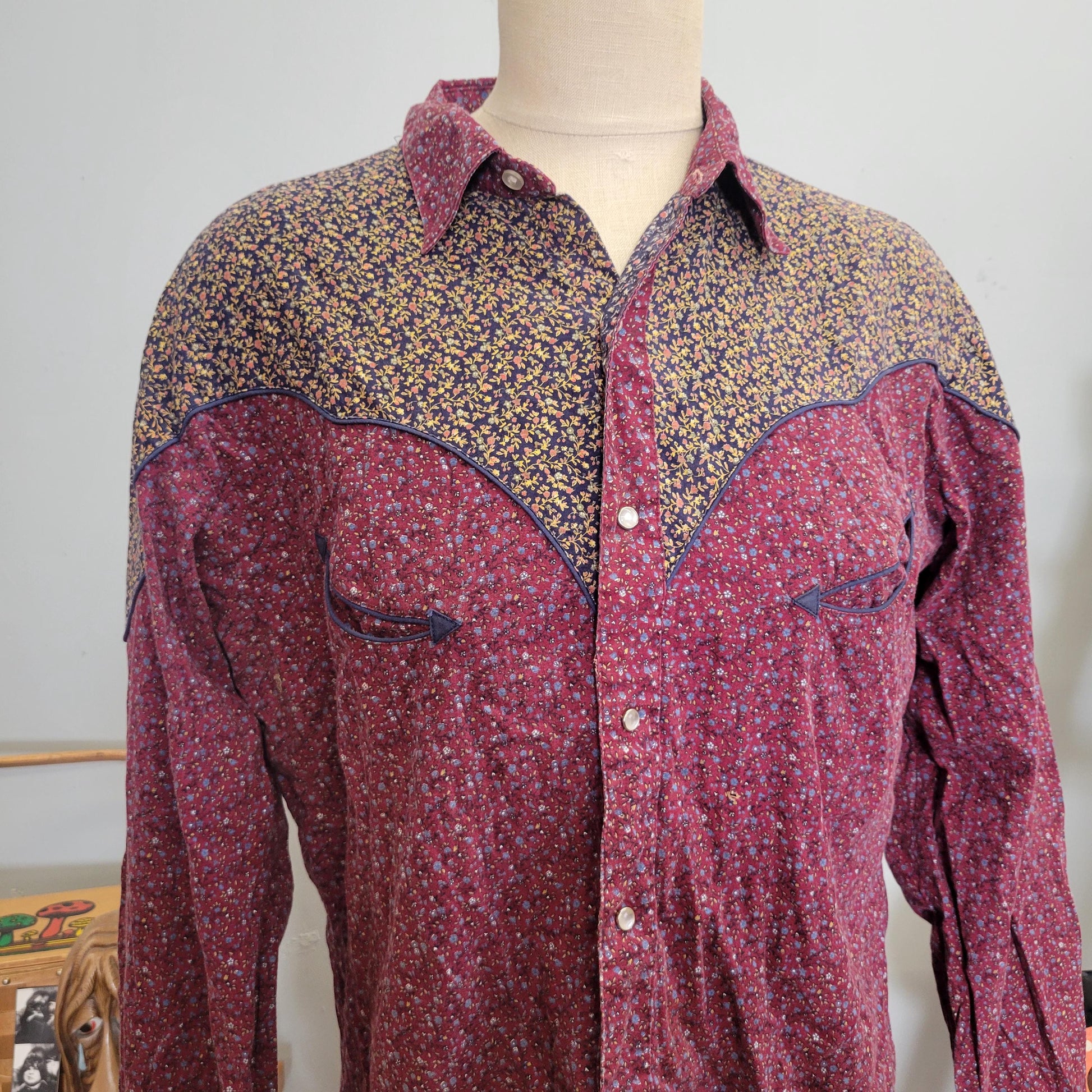 vtg 70s WESTERN BUTTON DOWN // vintage madman large mens rodeo western cowboy hippie retro ranch wear calico floral pattern oxford blouse