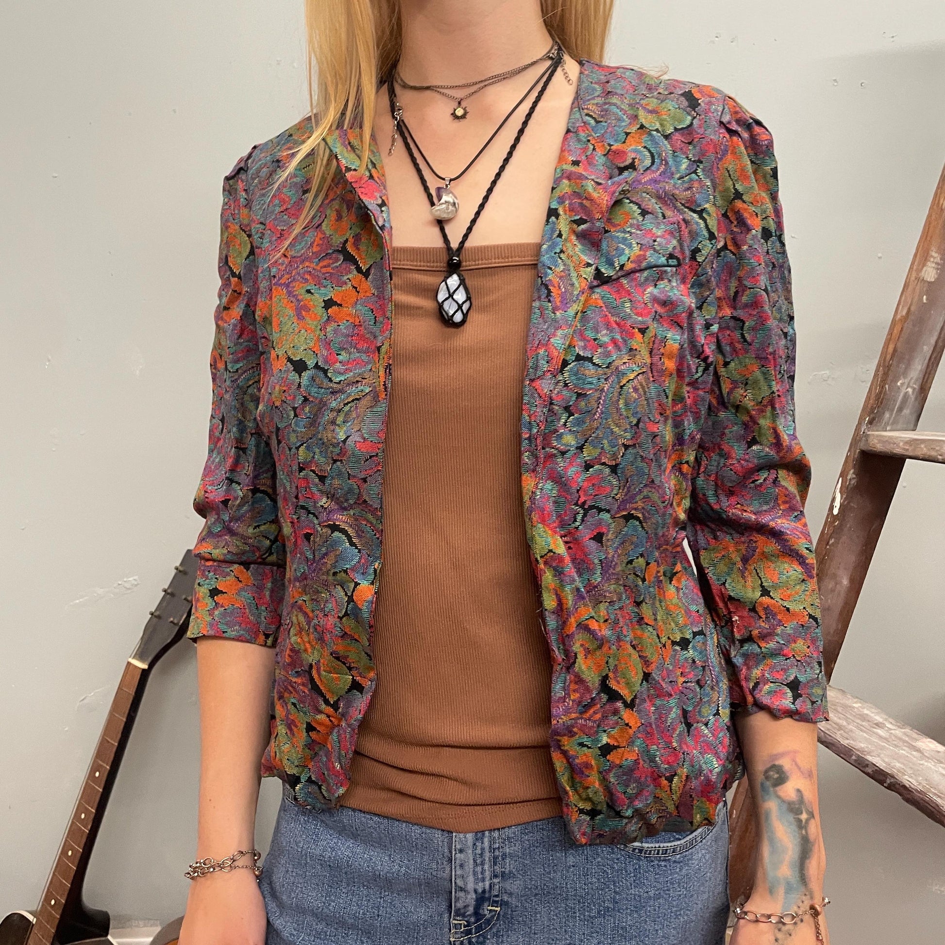 vtg 80s ABSTRACT PATTERNED BLOUSE // vintage psychedelic acid drip paisley oil spill open front crop top flowy rayon casual autumn y2k earth