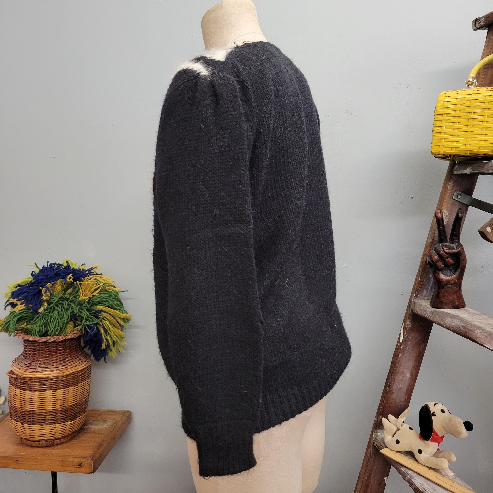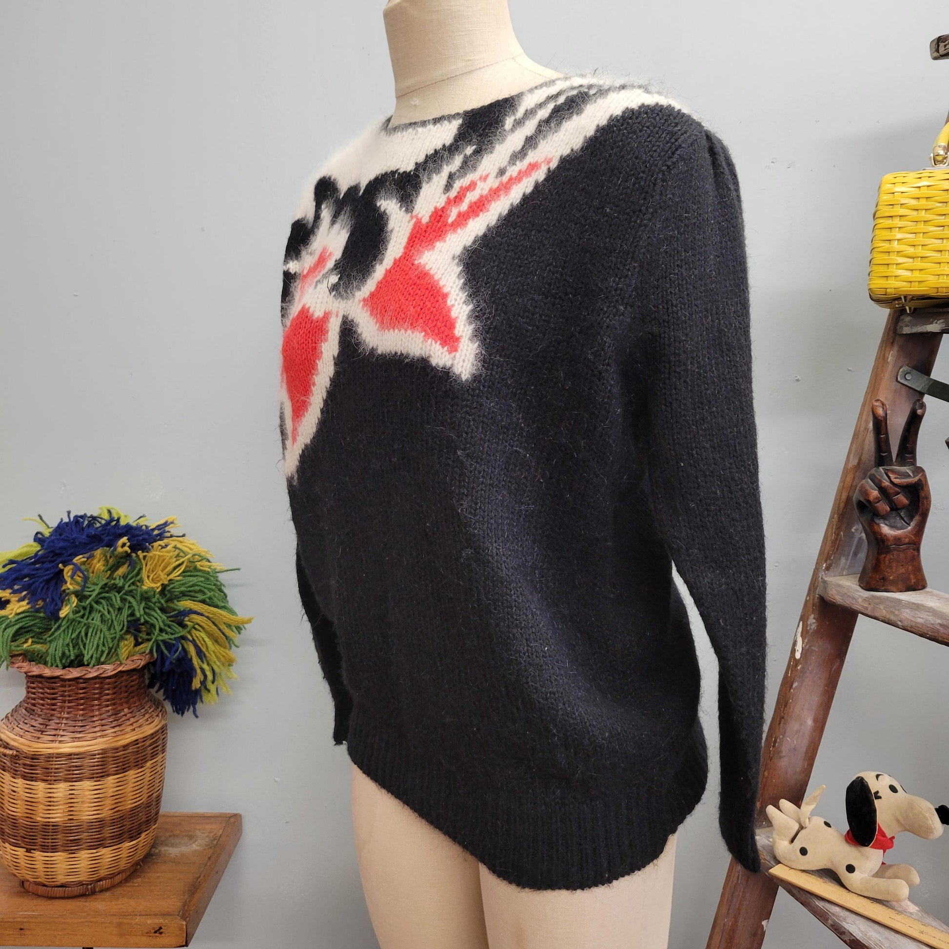 vtg 80s ANGORA FUR SWEATER // vintage angenie large womens furry fuzzy black red shaggy fancy autumn winter stylish abstract pattern feather