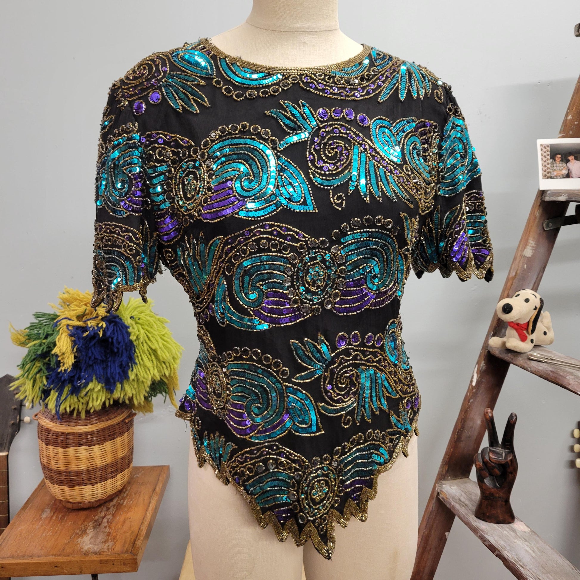 vtg 80s BEADED SEQUIN TOP // vintage laurence kazar xl womens silk fully beaded jewel toned festive holiday party evening wear statement