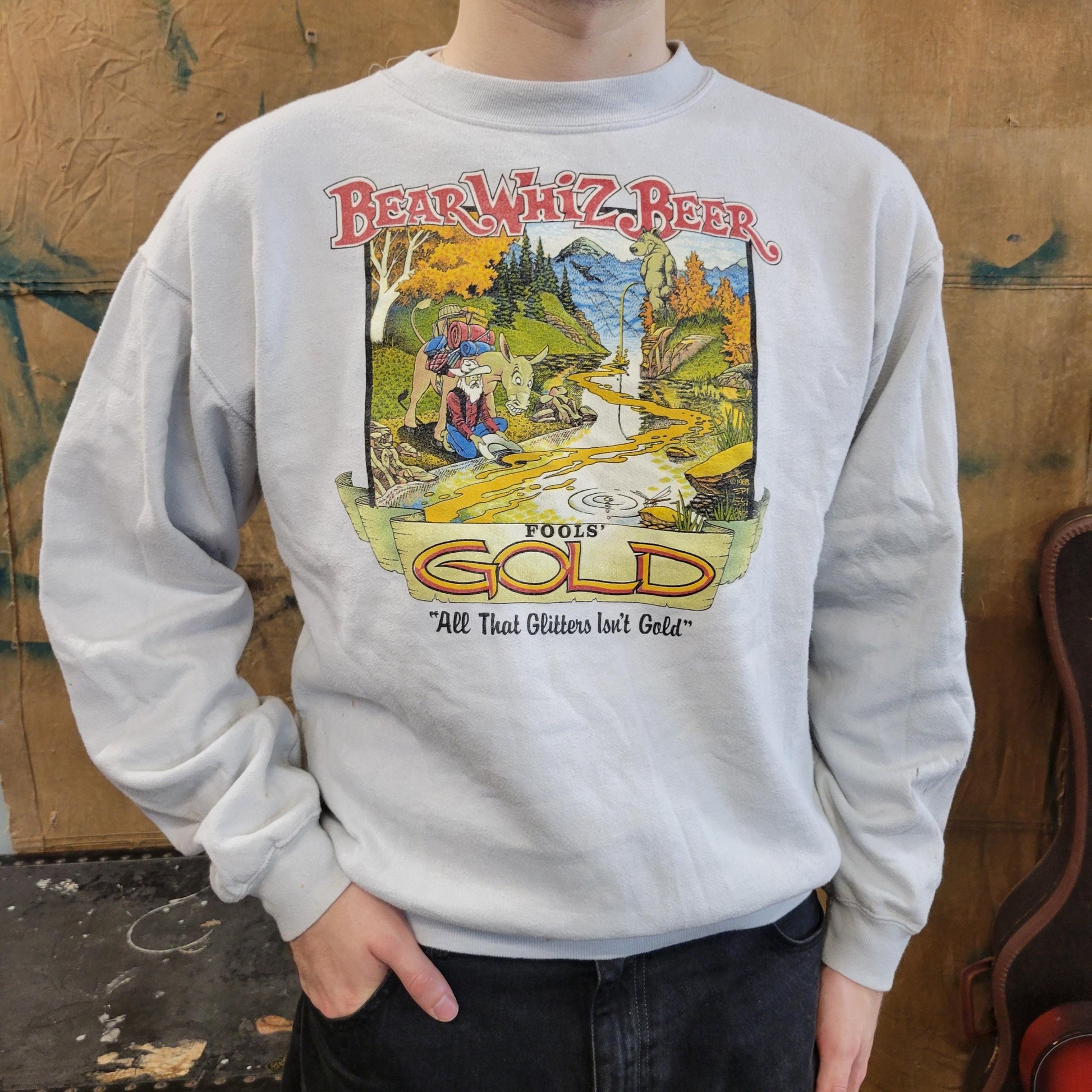 vtg 80s BEAR BEER SWEATSHIRT // vintage distressed wizz cartoon tourist camp fools glitter gold sweater comfy dad college frat cute 90s