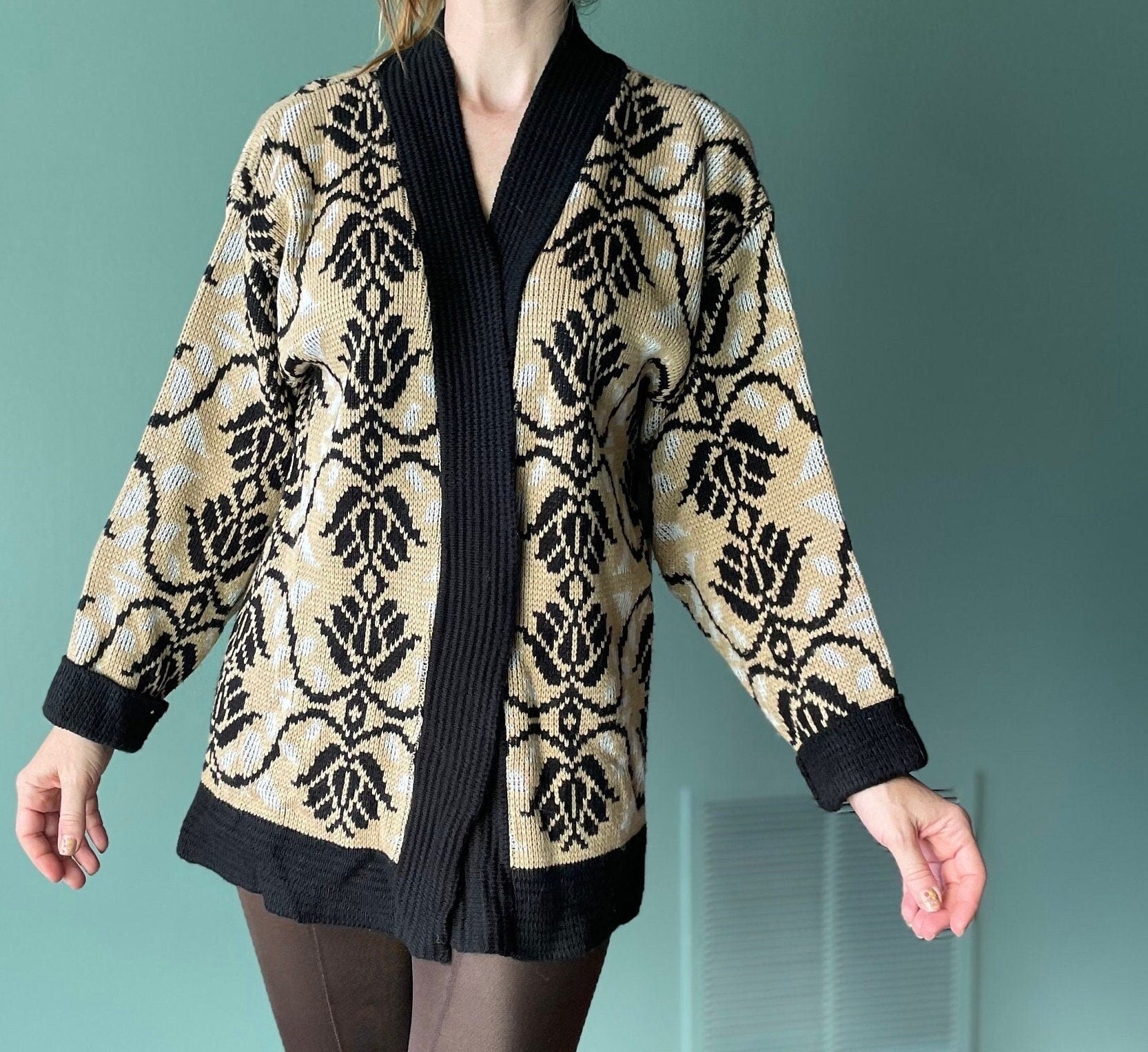 vtg 80s BLACK & GOLD CARDIGAN // vintage retro womens small bell sleeve autumn fashion floral pattern flare sleeve hippie retro pretty style