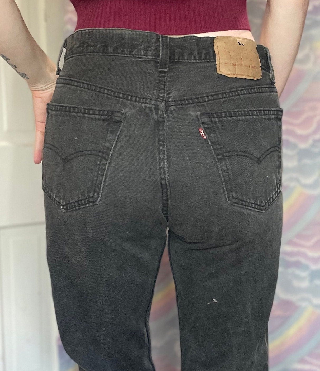 vtg 80s BLACK LEVIS 501 Button Fly Jeans // vintage red tab dark wash denim punk industrial mysterious classic fit 90s gray faded tapered 32