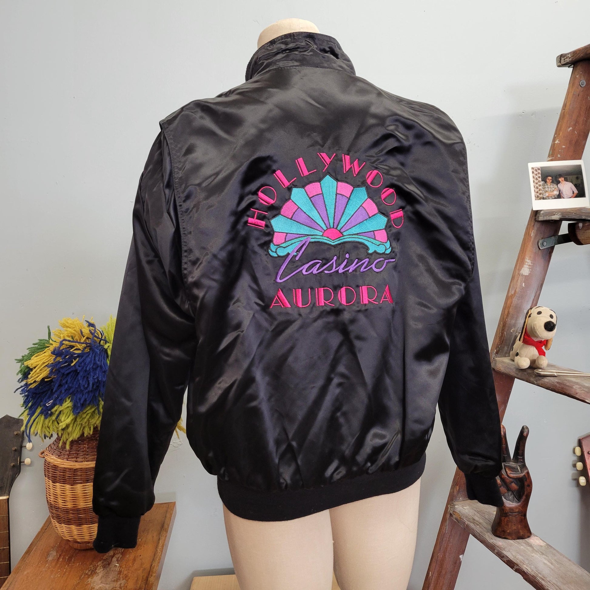 vtg 80s BLACK SATIN JACKET // vintage hollywood casino aurora apparel of las vegas medium womens unisex stained glass abstract embroidered