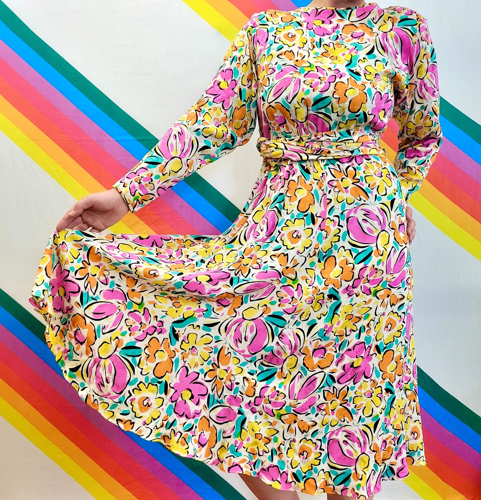 vtg 80s BRIGHT FLORAL DRESS // pastel watercolor flower print belted rayon lightweight funky flowy boutique full length flower power slinky
