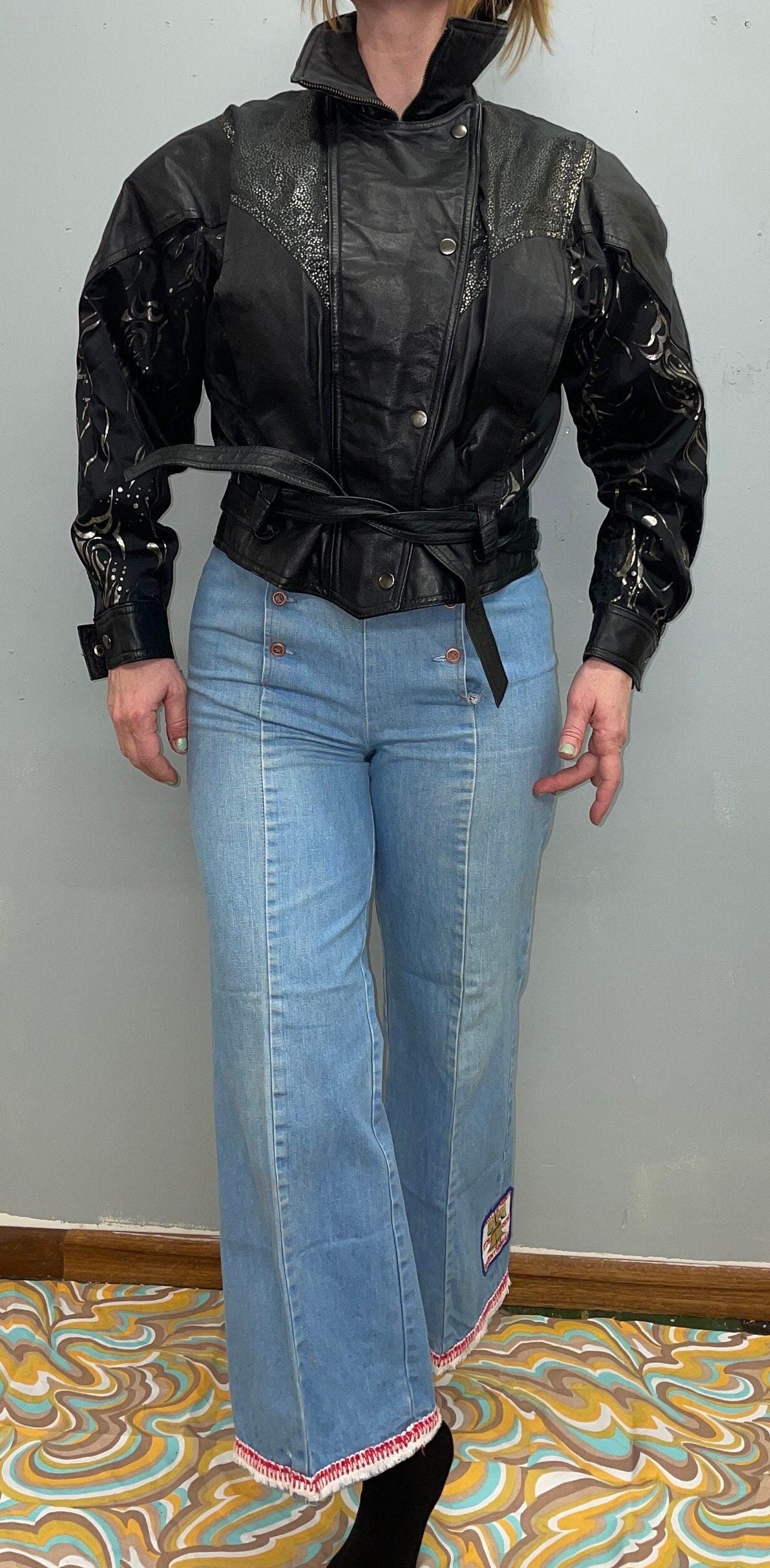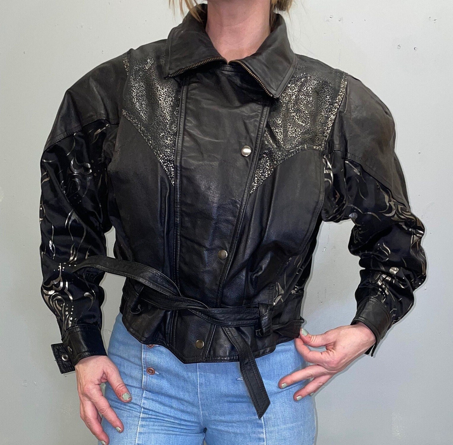 vtg 80s CROPPED LEATHER JACKET / vintage black & silver abstract print belted popped collar biker babe new wave glitter painted jacket