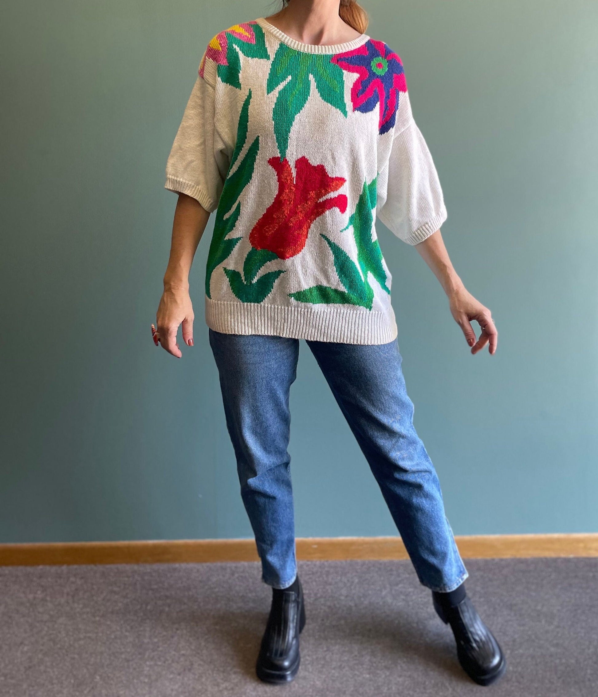 vtg 80s FLORAL PATTERN SWEATER // vintage leslie fay cotton short sleeve sweater haberdashery soft knit abstract flowy comfy casual retro