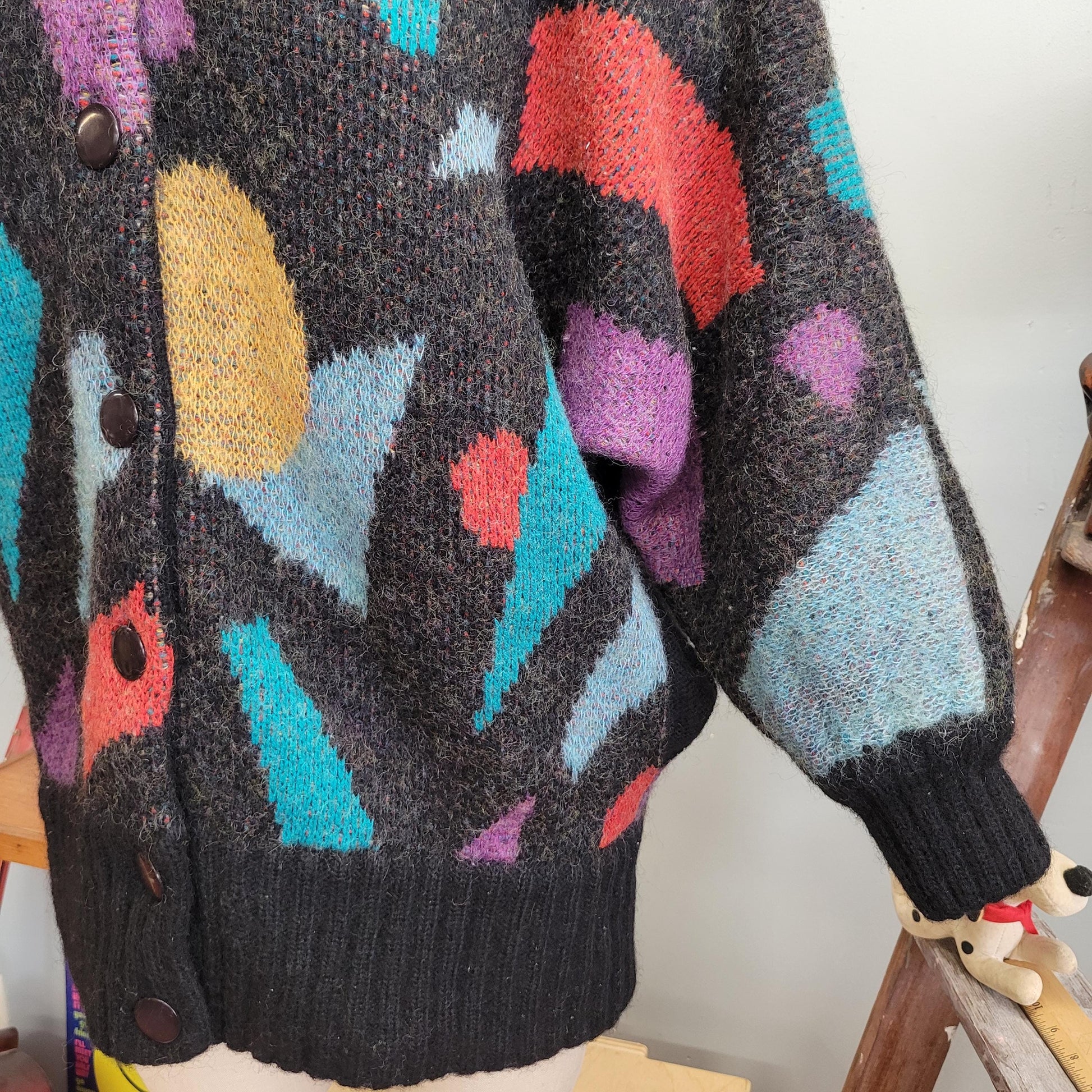 vtg 80s FUNKY ABSTRACT CARDIGAN // vintage sweater jb diffusion large oversized button up sweater jacket turtleneck slouchy geometric fuzzy