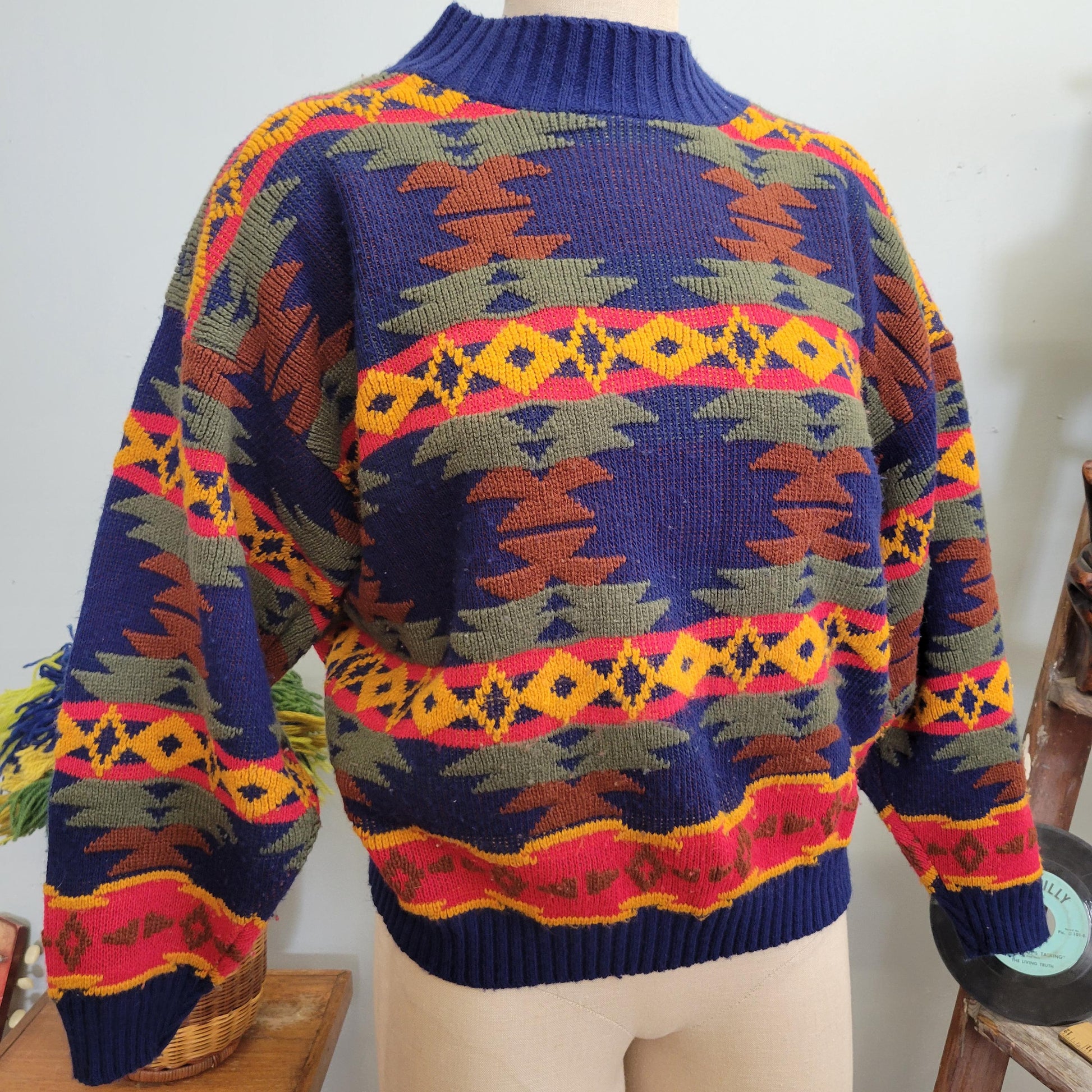 vtg 80s GEOMETRIC PATTERN SWEATER // vintage jj browne usa medium warm tones Aztec print southwestern neon abstract loud comfy slouchy style