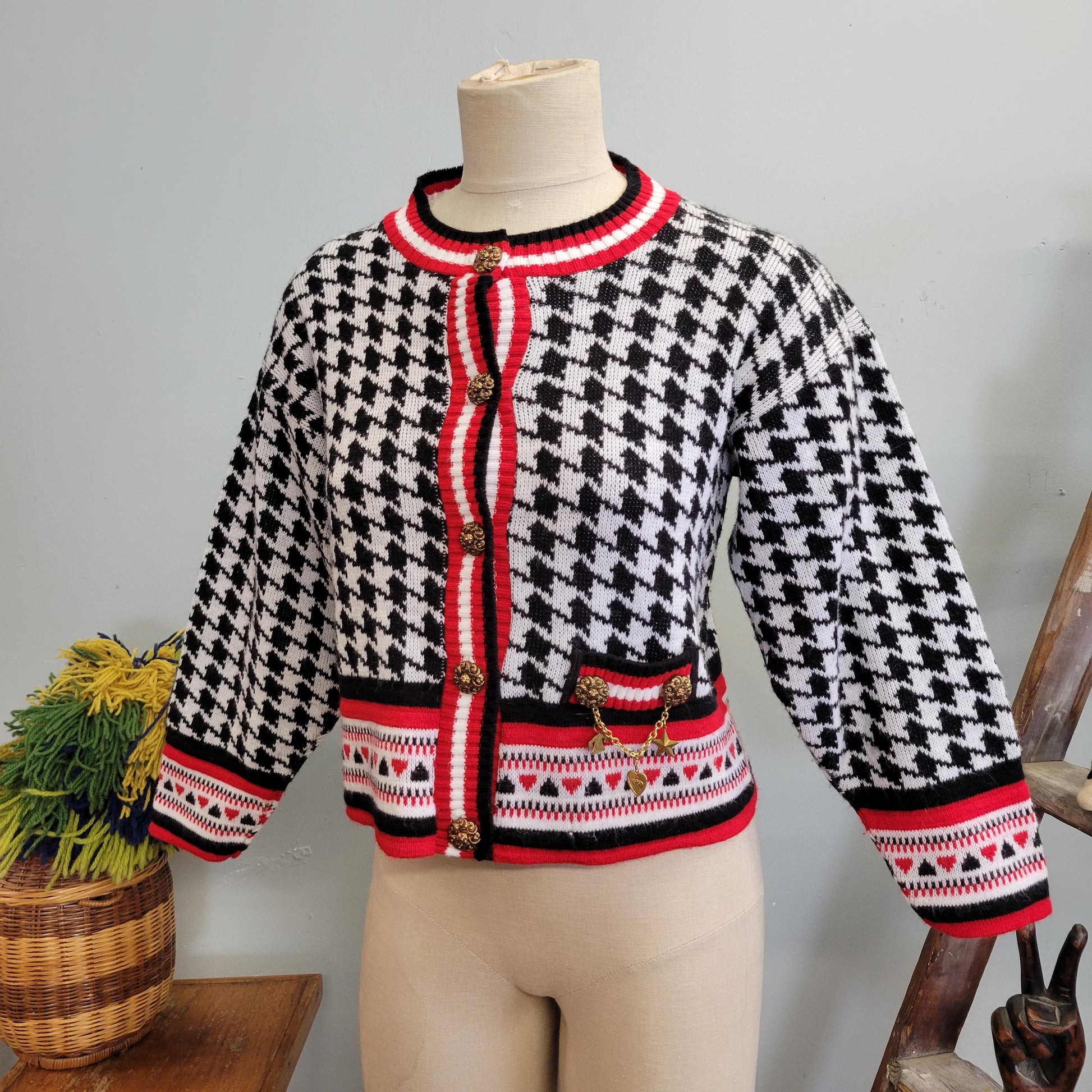 vtg 80s KNIT HOUNDSTOOTH SWEATER // vintage knitwaves small cardigan fran fine gold chain dior style checkered mod two tone cropped sweater