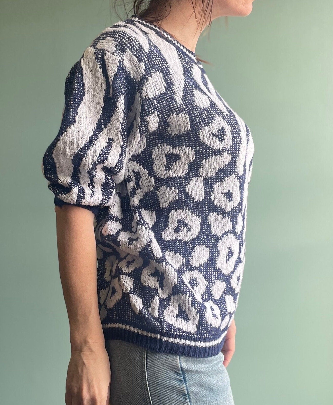 Vintage 80s Animal Print Puff Sleeve Sweater / Leopard Sweater / Renee Tener Jeanne Pierre / 3D Abstract Sweater / Puffed Sleeve Sweater