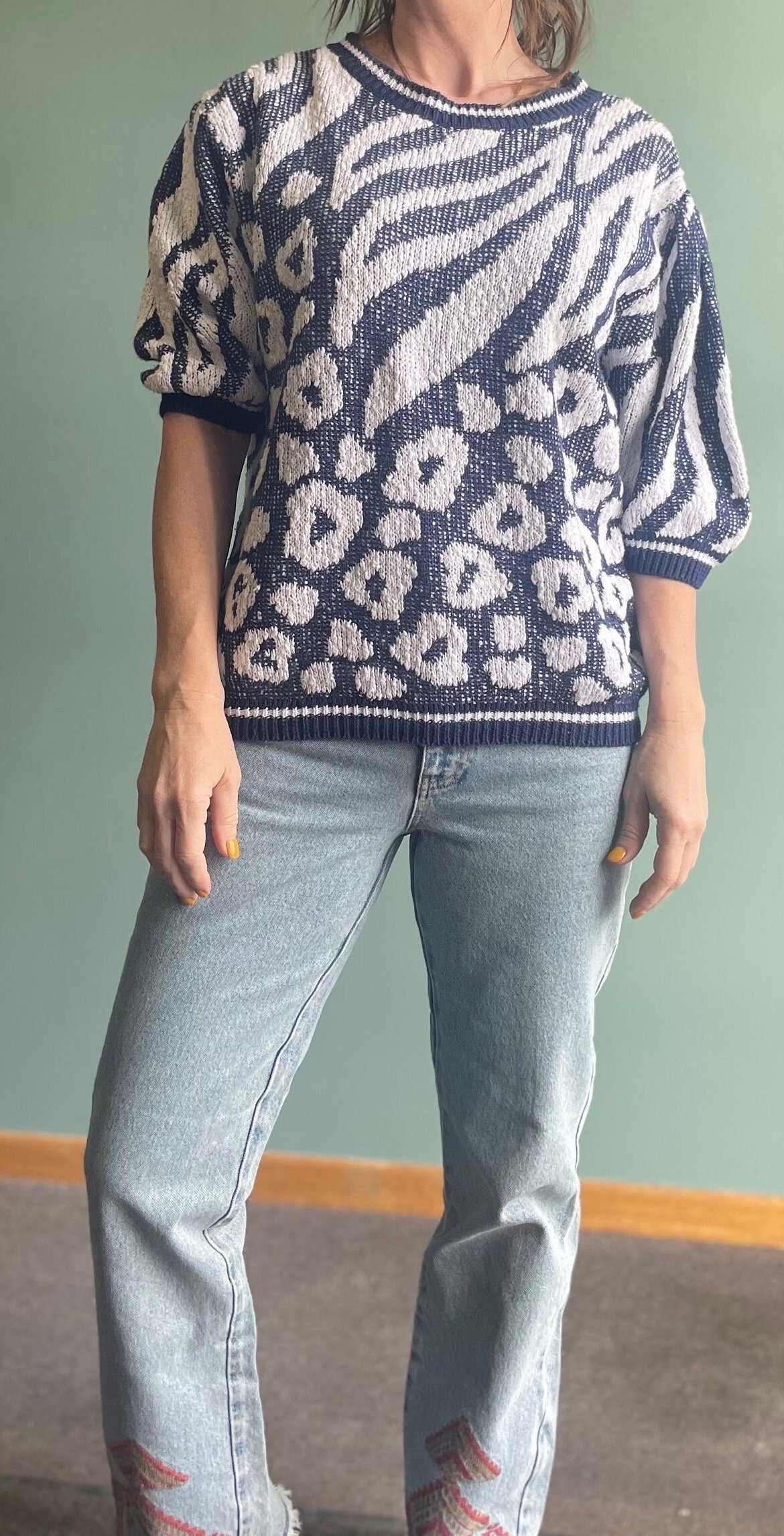 vtg 80s LEOPARD PRINT short sleeve SWEATER // Renee Tener Jeanne Pierre / 3D animal print shirt high society snob chettah cougar cat fight