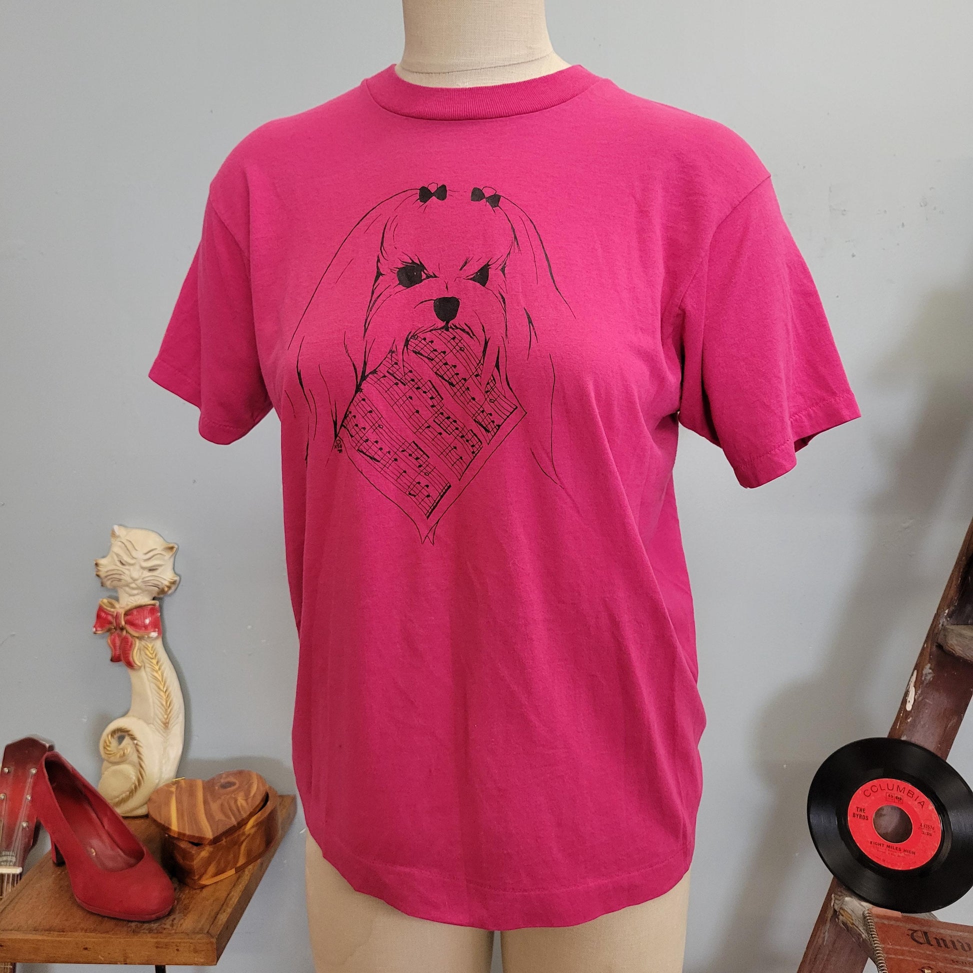 vtg 80s MUSICAL DOG TSHIRT // vintage screen stars large cute random dog eating sheet music piano teacher gift shih tzu lhasa apso dog mom