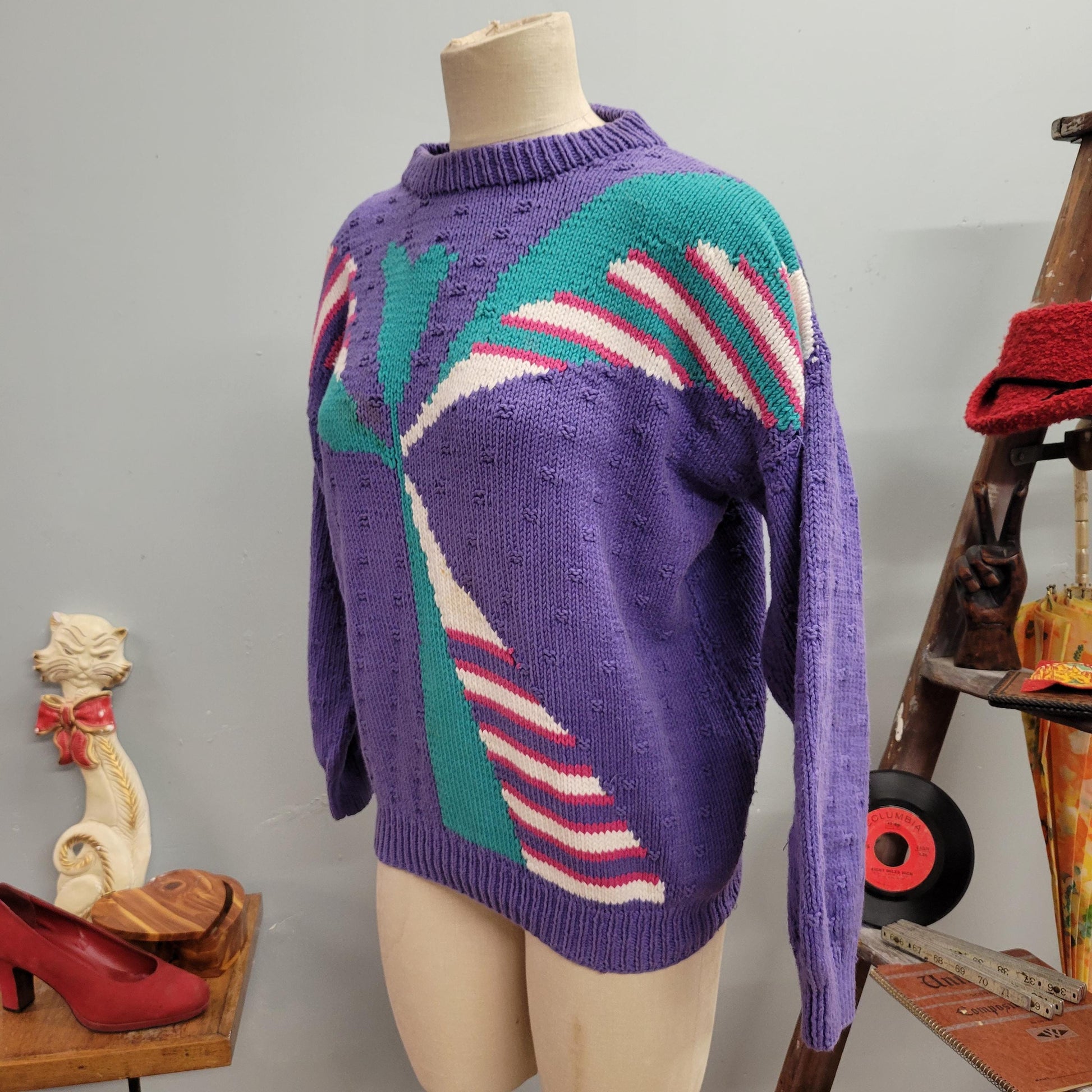 vtg 80s PATTERNED KNIT SWEATER // vintage funky cute medium womens pastel lavender abstract print chunky cozy autumn slouchy casual ribbed