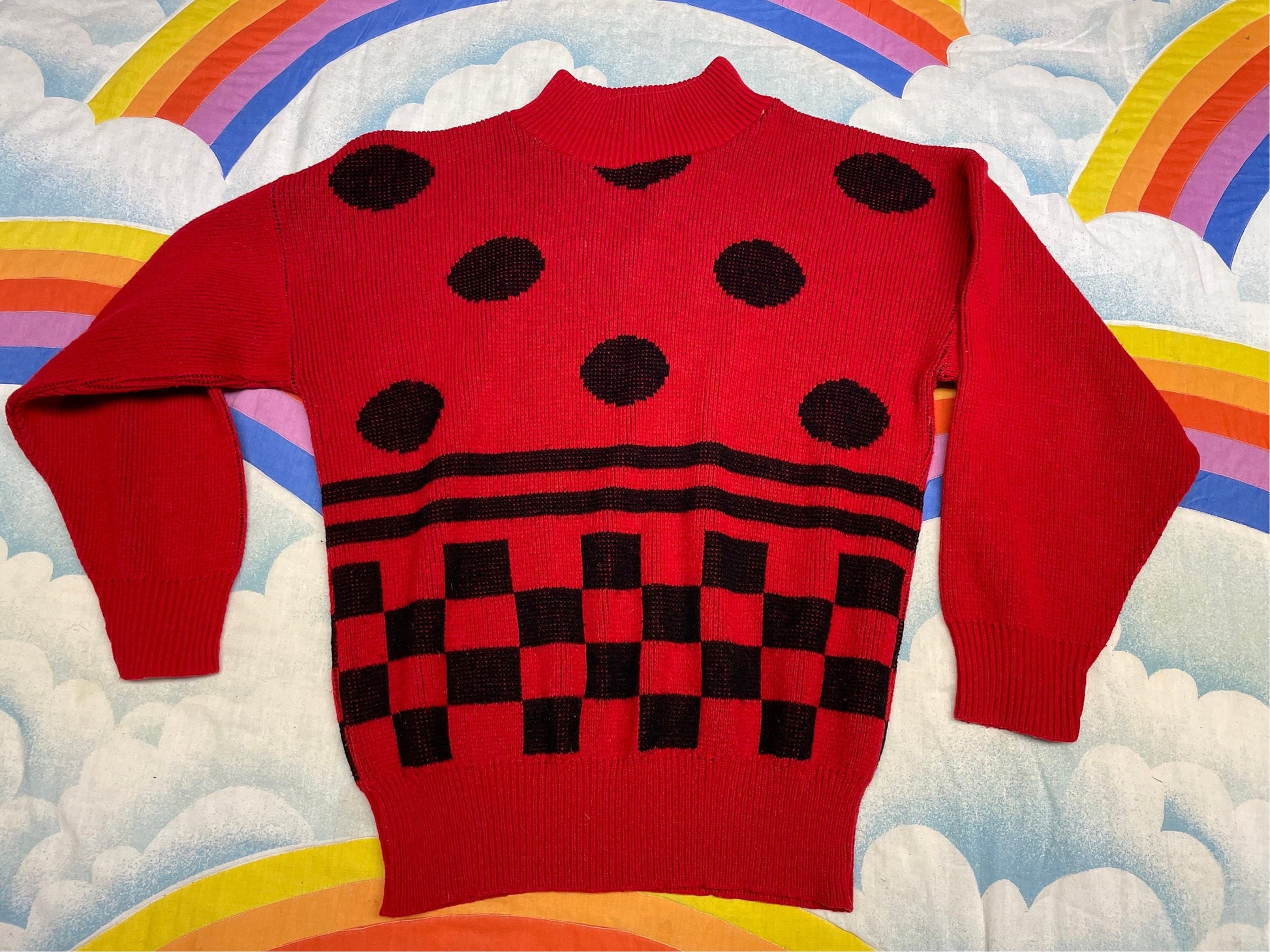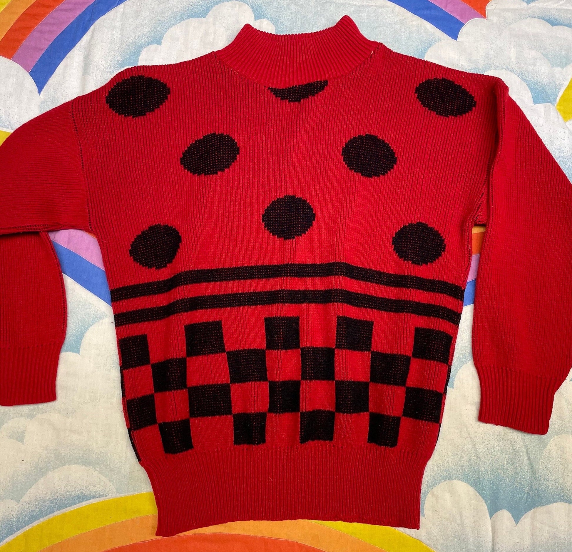 vtg 80s POLKA DOT CHECKERED Sweater // vintage red and black cropped knit autumn fall style ribbed textured abstract op art checkerboard top