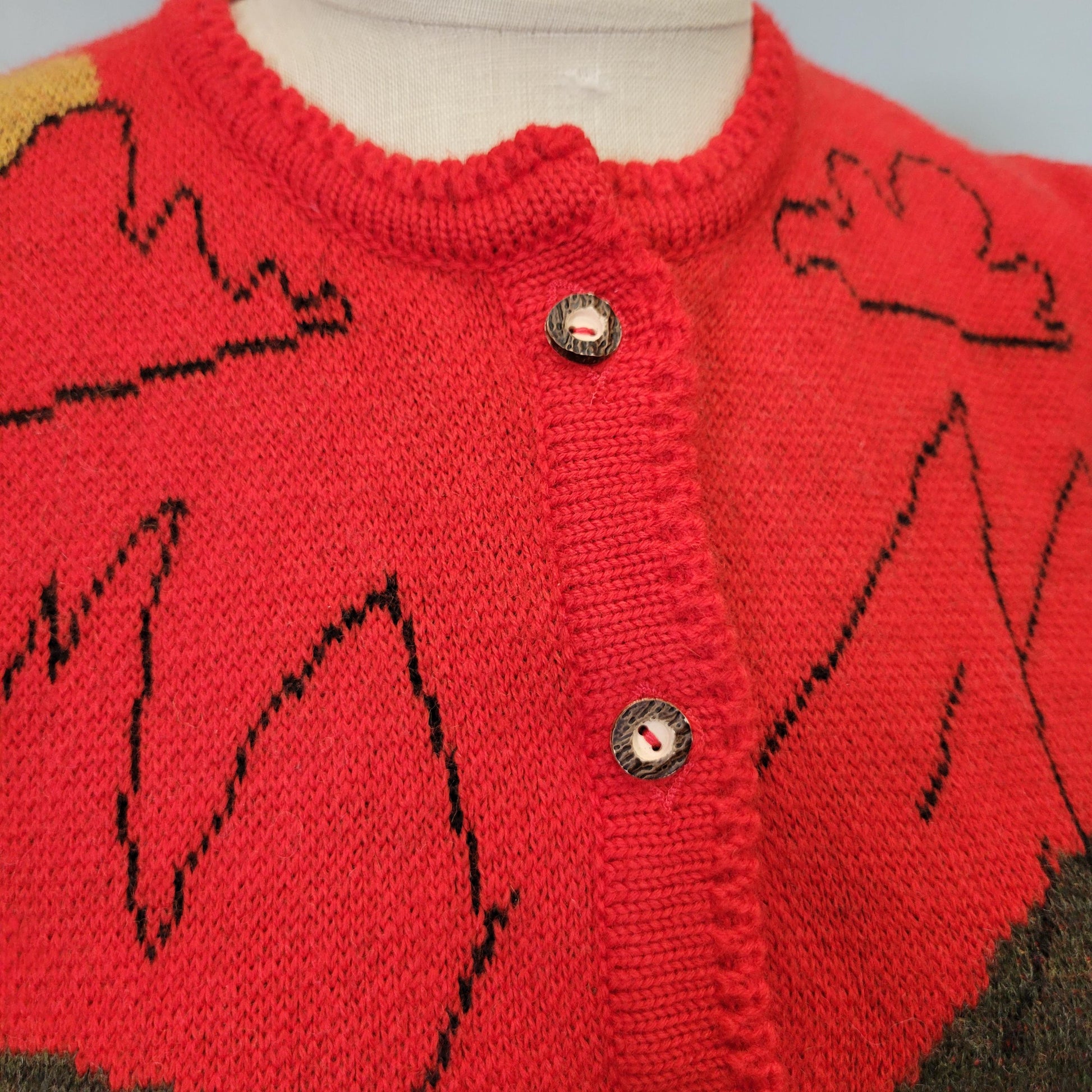 vtg 80s PUFF SLEEVE CARDIGAN // vintage pictorial small red mountain trees houses folk art landscape scene patterned knit autumn sweater