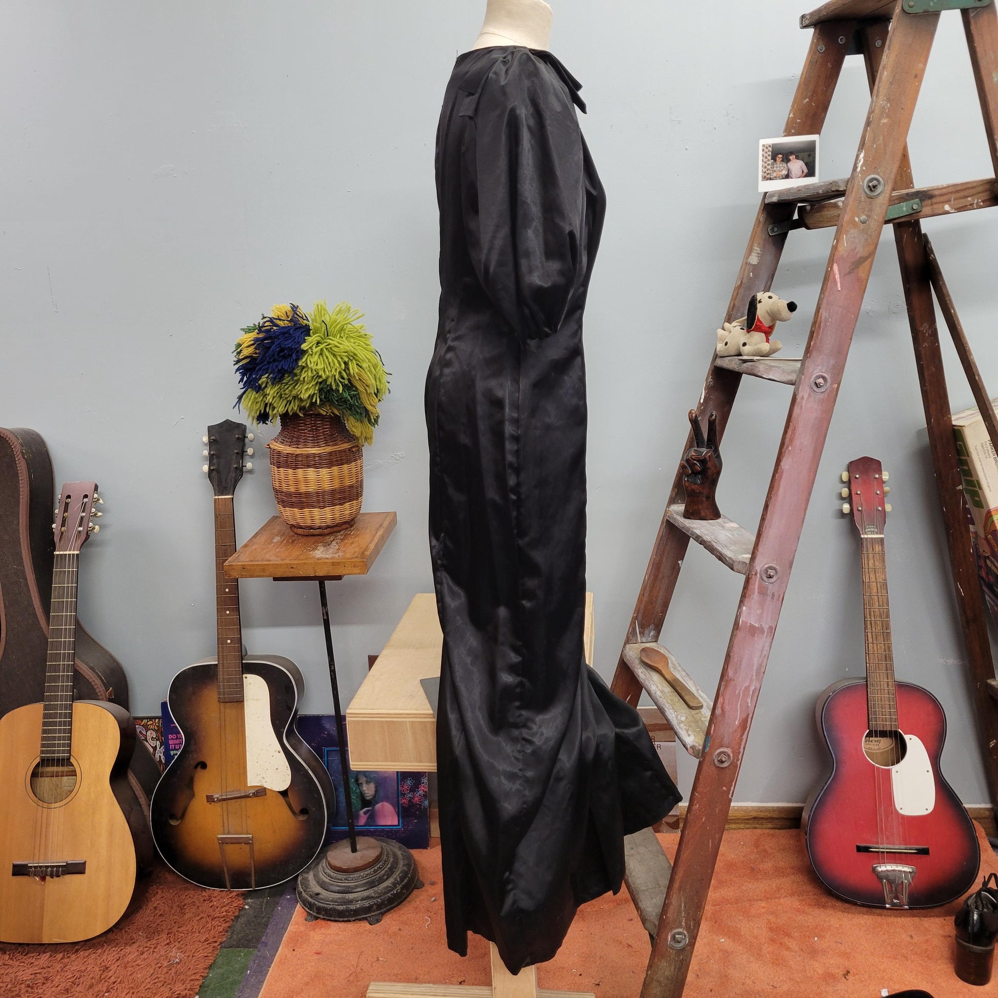 vtg 80s SATIN PUFF SLEEVE dress // vintage inky black gown gothic prom style retro silky full length fit n flare party evening dress fancy