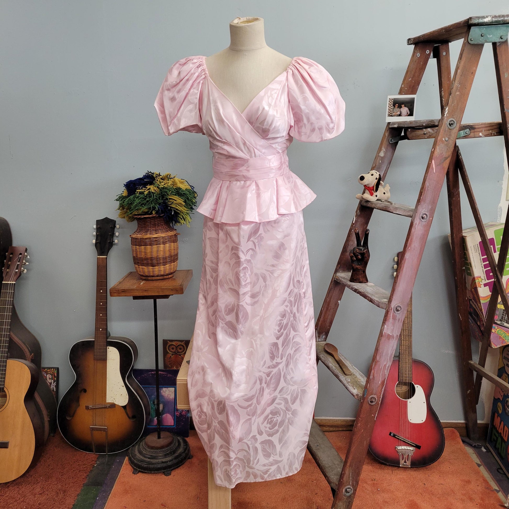 vtg 80s SATIN PUFF SLEEVE dress / vintage lola berent superstition 7/8 womens small pastel pink floral brocade big sleeves peplum party gown