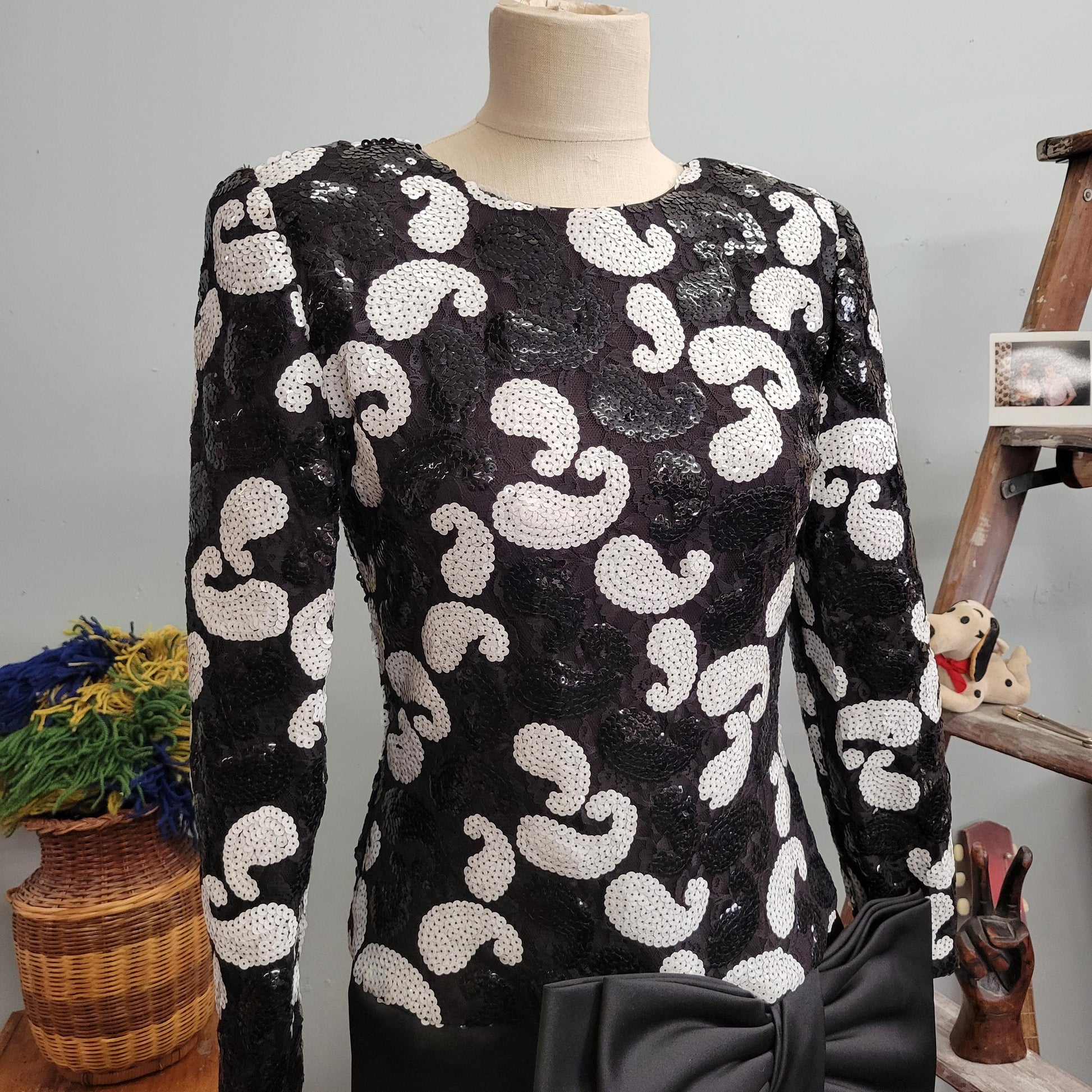 vtg 80s SEQUIN BOW GOWN // vintage martinique size 12 womens paisley patterned black & white sequins mod retro evening prom gown statement