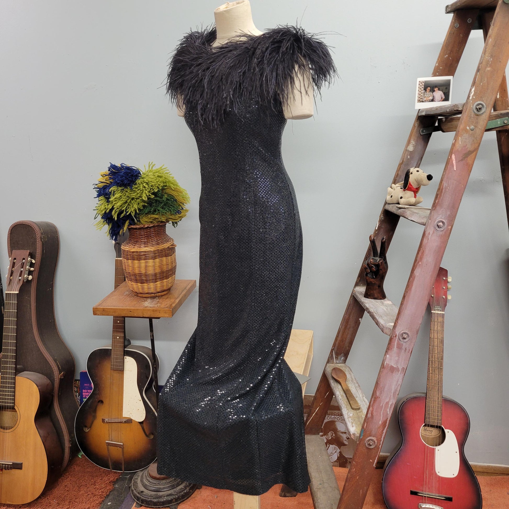 vtg 80s SEQUINED FEATHER DRESS / vintage jump size 9/10 holiday new years gown inky black full length sexy party couture style evening dress