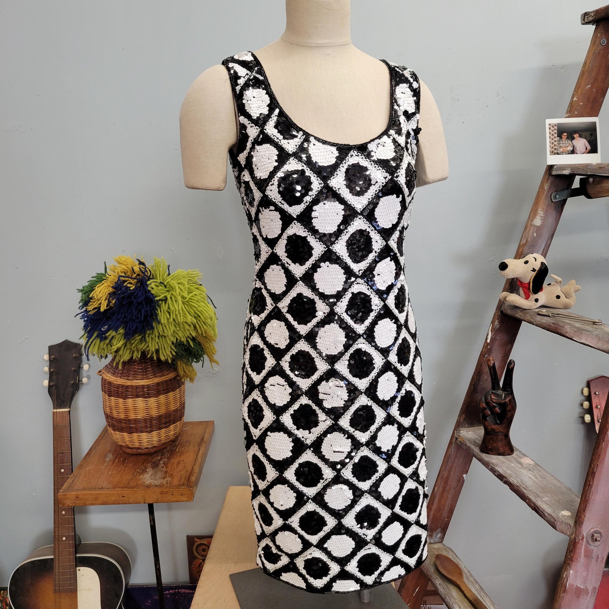 vtg 80s SEQUINED TANK DRESS // vintage tadashi size 8 medium womens holiday new years op art space age black white checkered mod mini dress