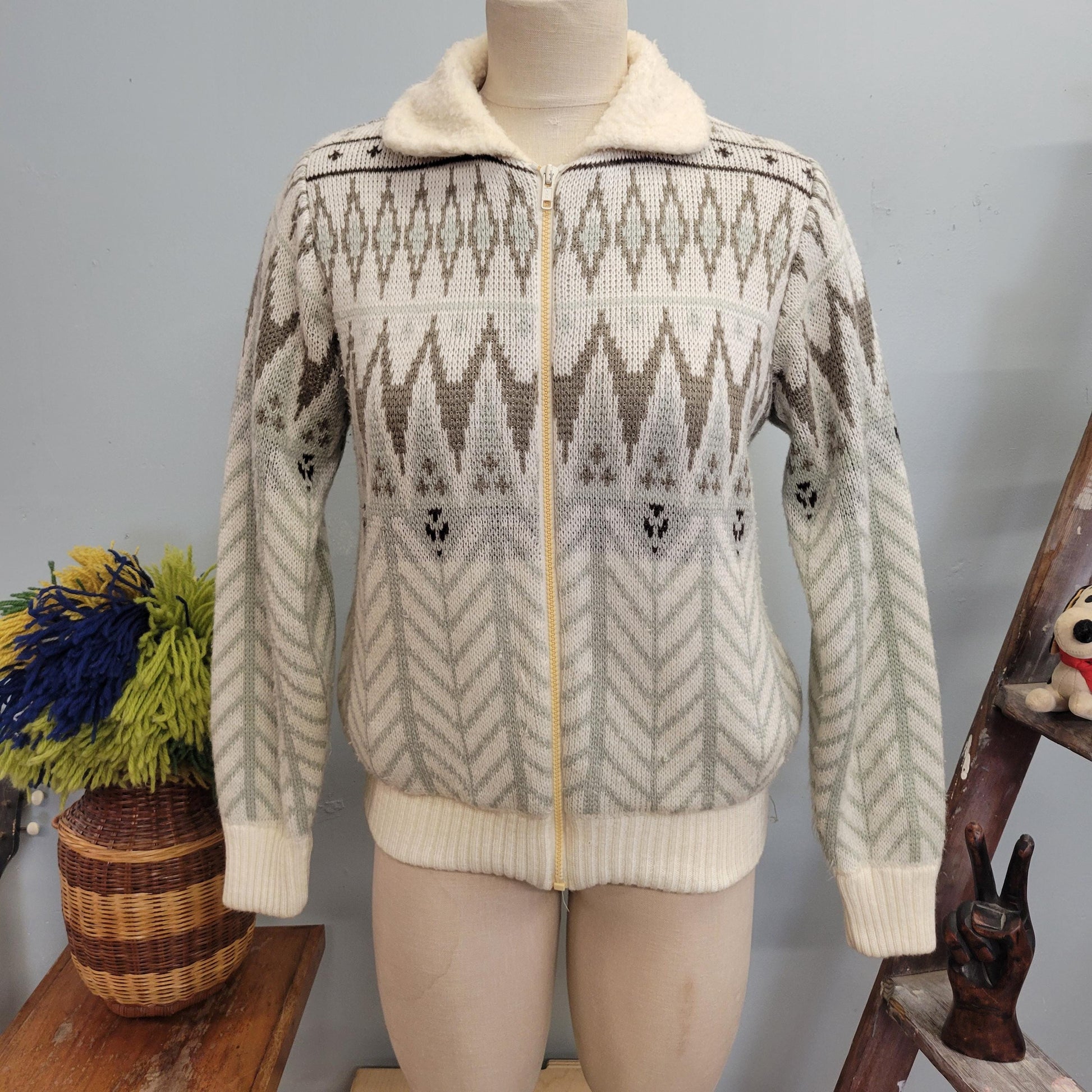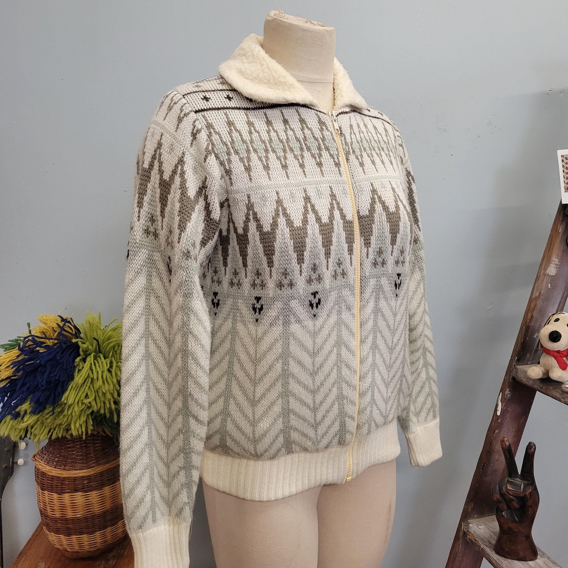 vtg 80s SHERPA WINTER SWEATER // vintage italian mob medium nordic zip up sweater jacket fair isle collared geometric neutral tones winter