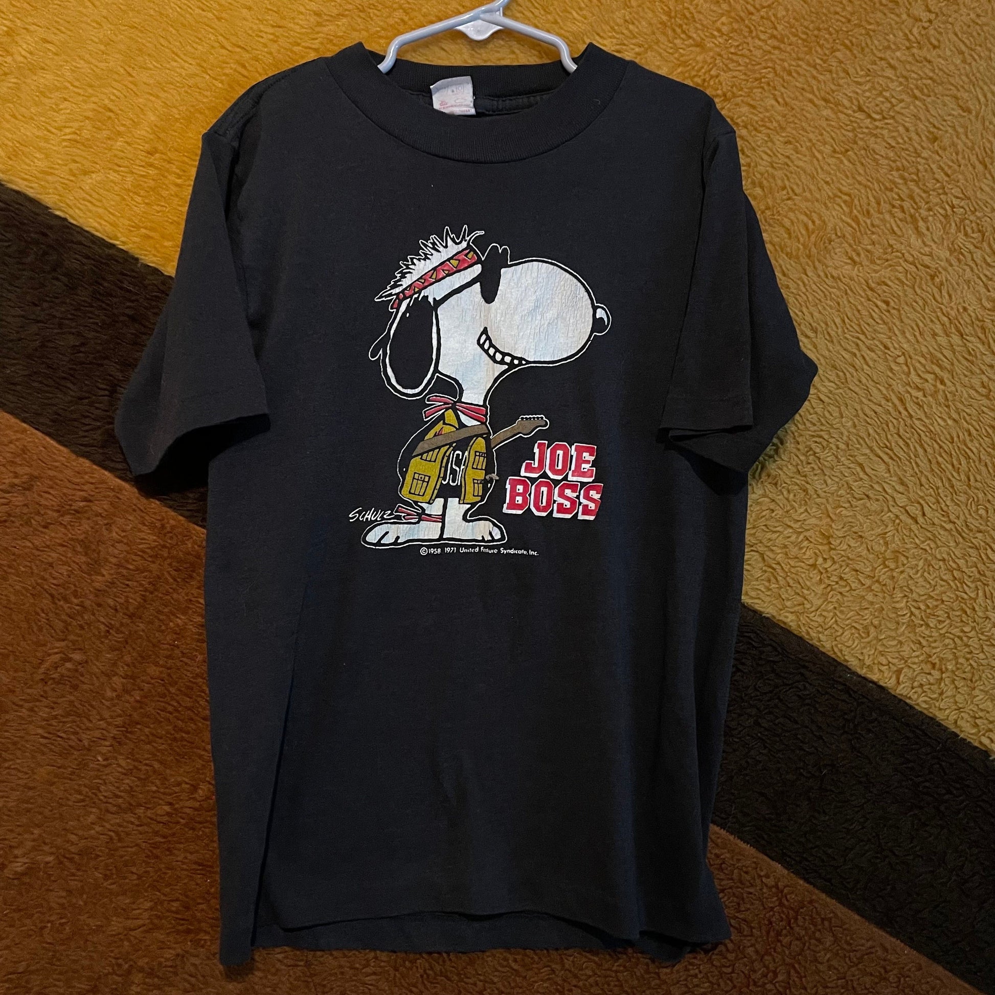 vtg 80s paper thin Snoopy Bruce Springstein joe boss hippie rock band graphic tee charlie brown peanuts black fitted youth large baby tee pop culture retro pun