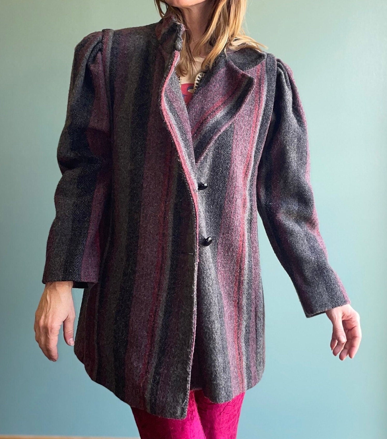 Vintage 80s Striped Wool Coat / Puffed Sleeve Pink And Gray New Wave Coat / Stylish Winter Coat