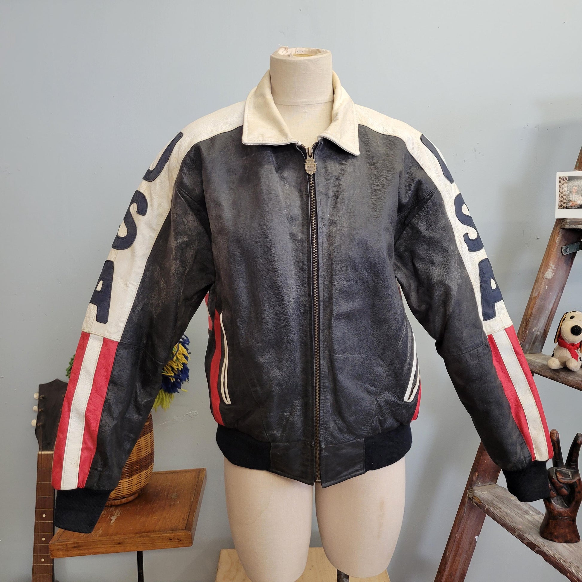 vtg 80s USA LEATHER JACKET // vintage michael hoban where mi north beach medium american bomber striped coat patriot flag pattern winter