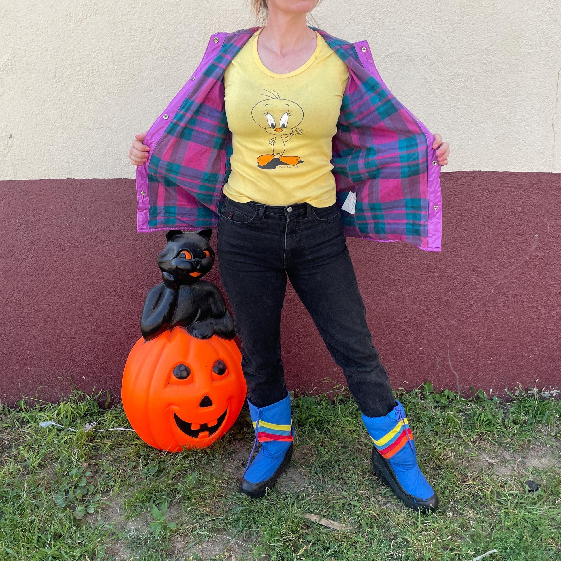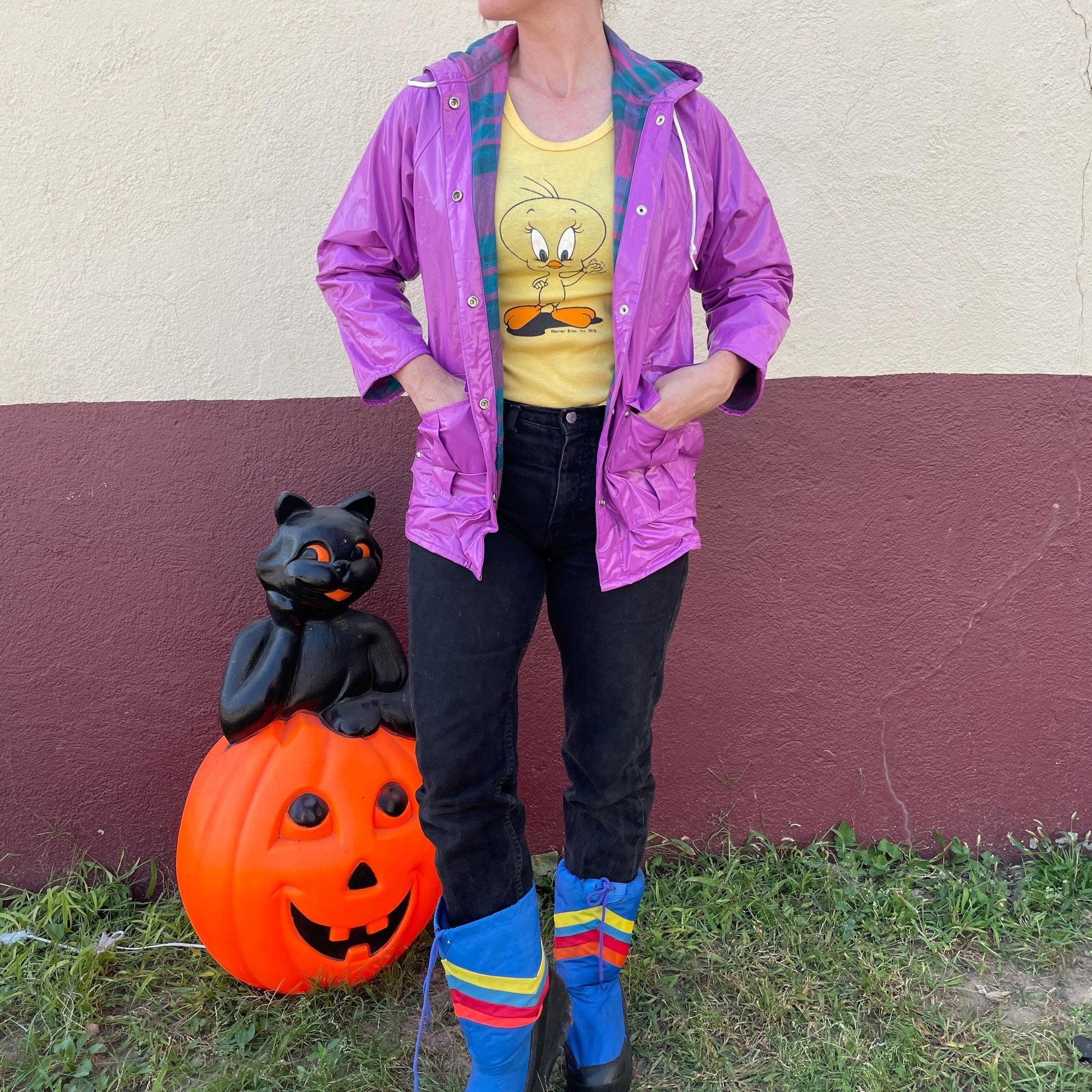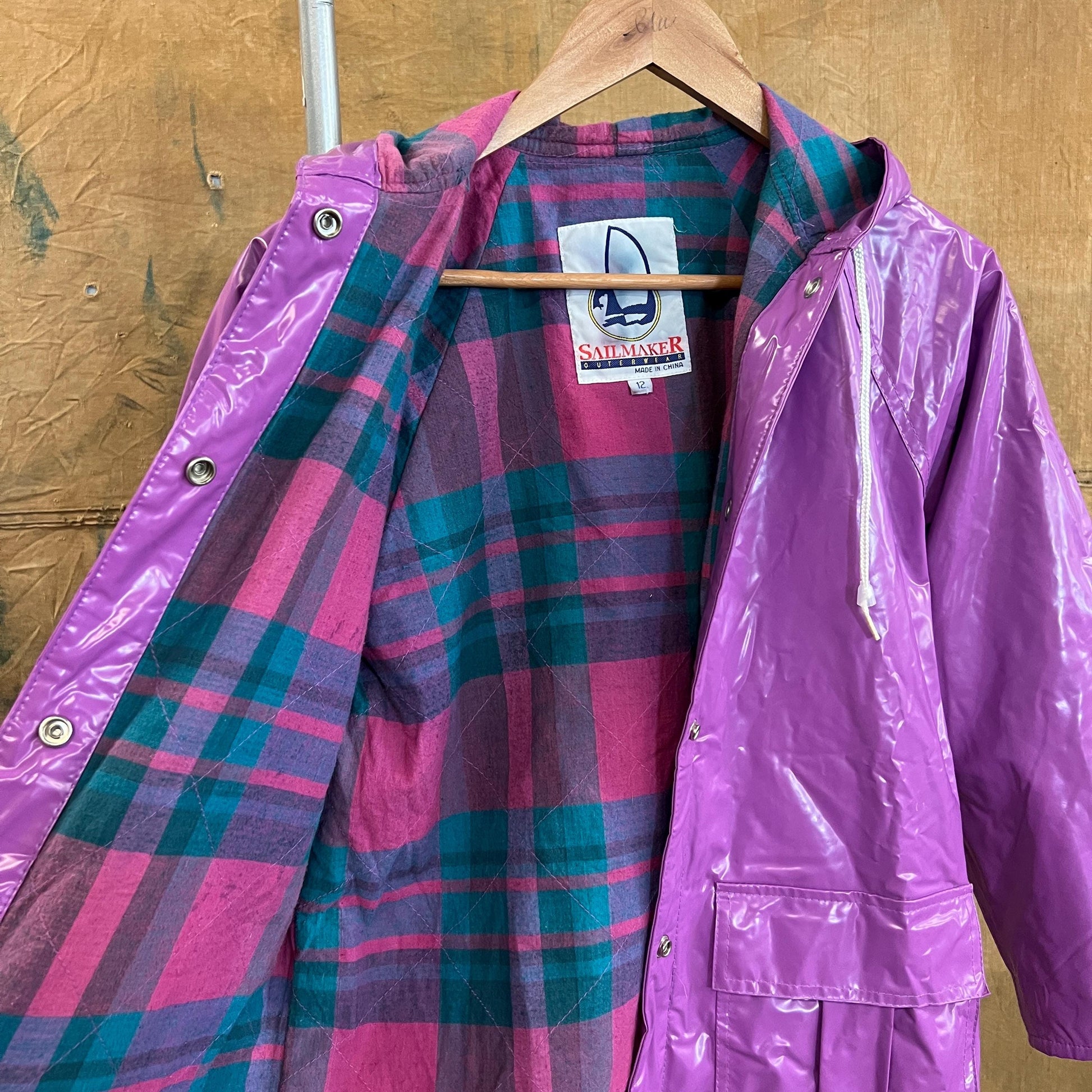 vtg 80s VINYL RAIN JACKET // vintage bright purple hooded autumn stranger things grunge pvc wet look shiny waterproof quilted parka plaid