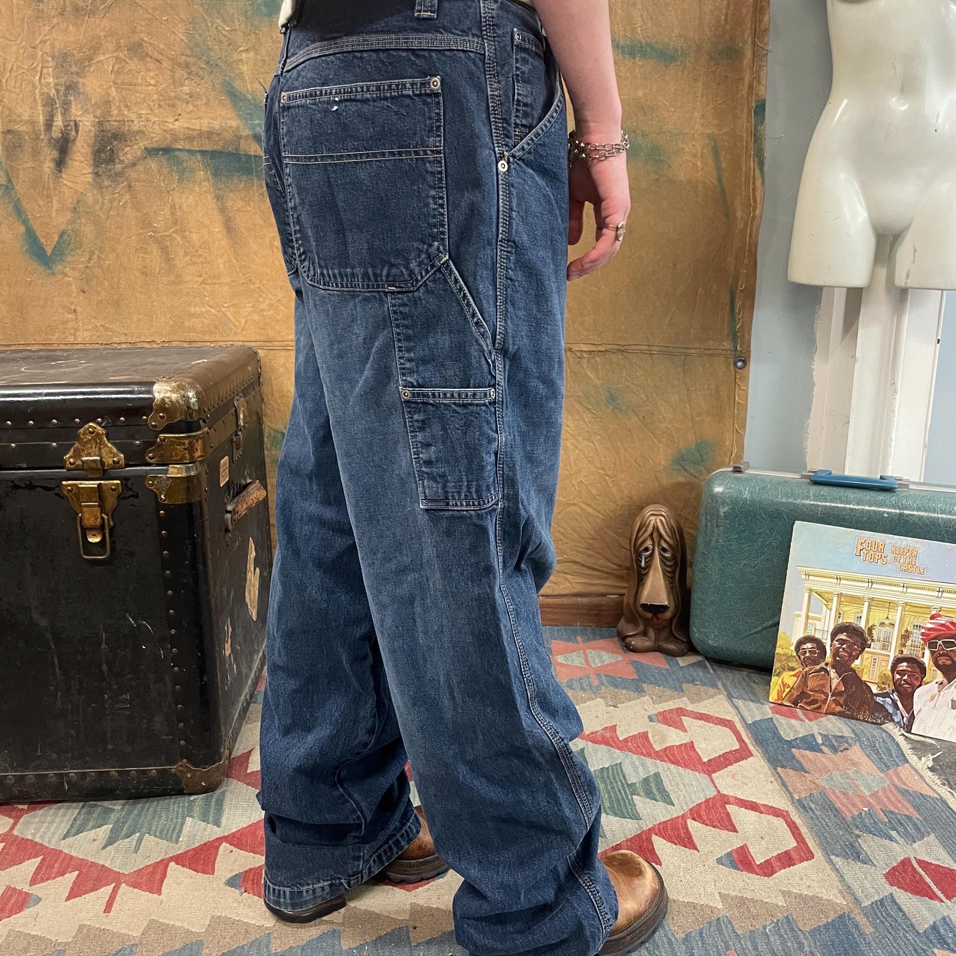 vtg 90s BAGGY BLUE JEANS // vintage y2k indigo dark wash stright leg boot cut carpenter industrial grunge relaxed fit cargo jorts distressed