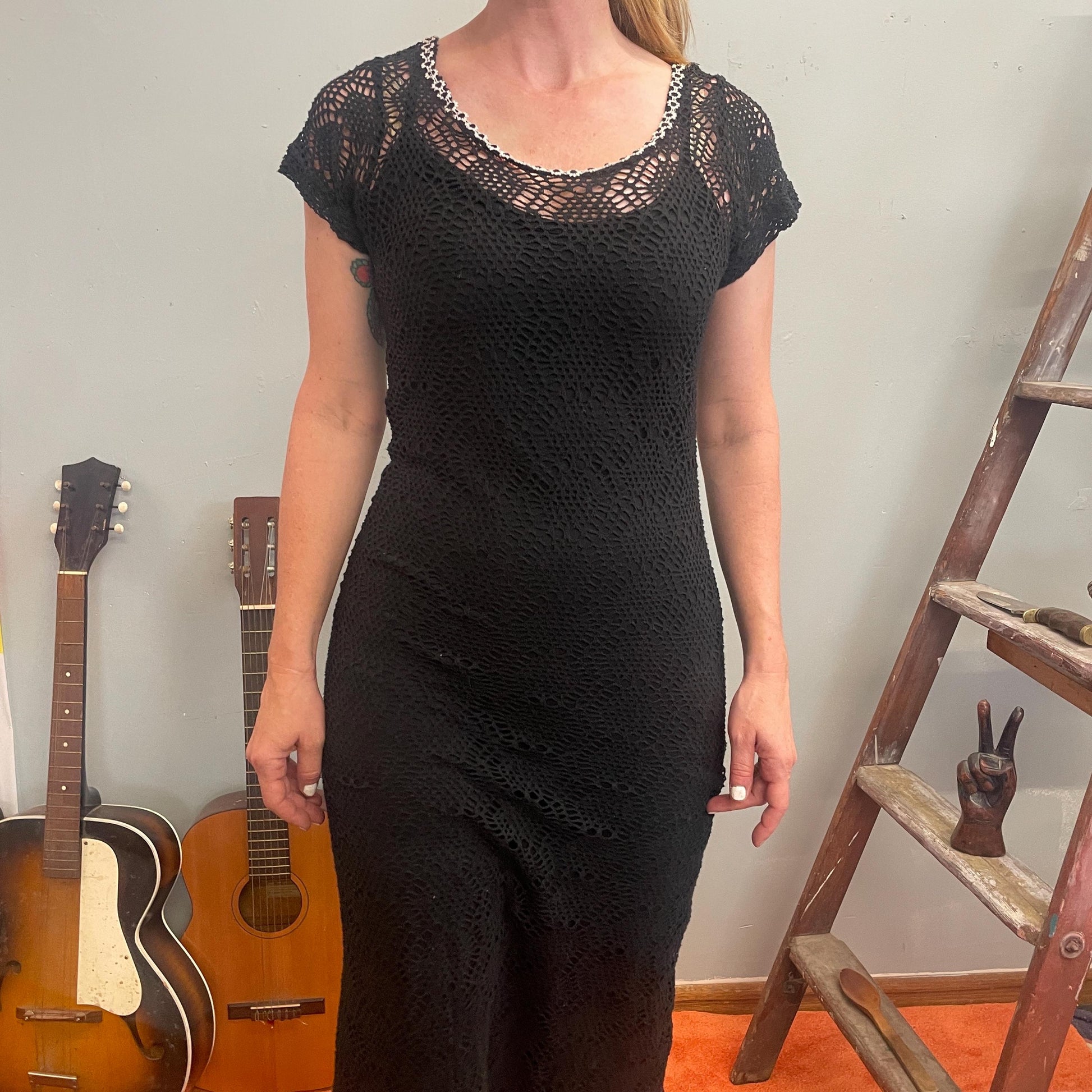 vtg 90s BLACK CROCHET DAISY Dress // sheer mesh white flower lined full length net maxi tank dress soft goth school minimalist lbd y2k style
