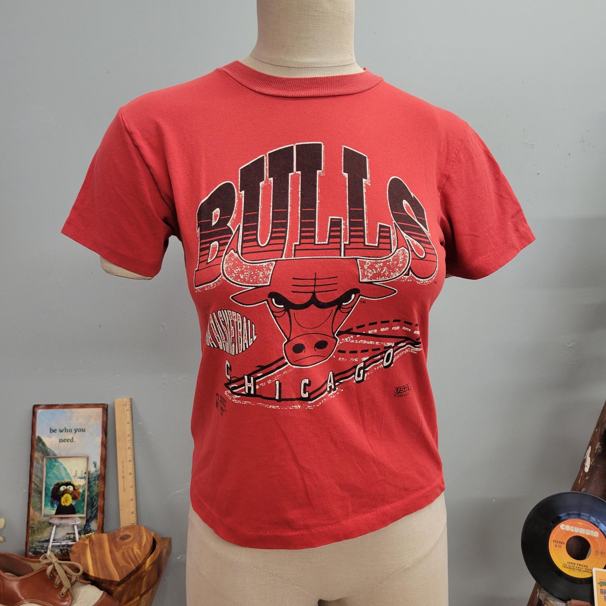 vtg 90s BULLS BASKETBALL TSHIRT/ vintage chicago bulls usa lineup youth large Michael Jordan sports paper thin baby tee crop top fitted top