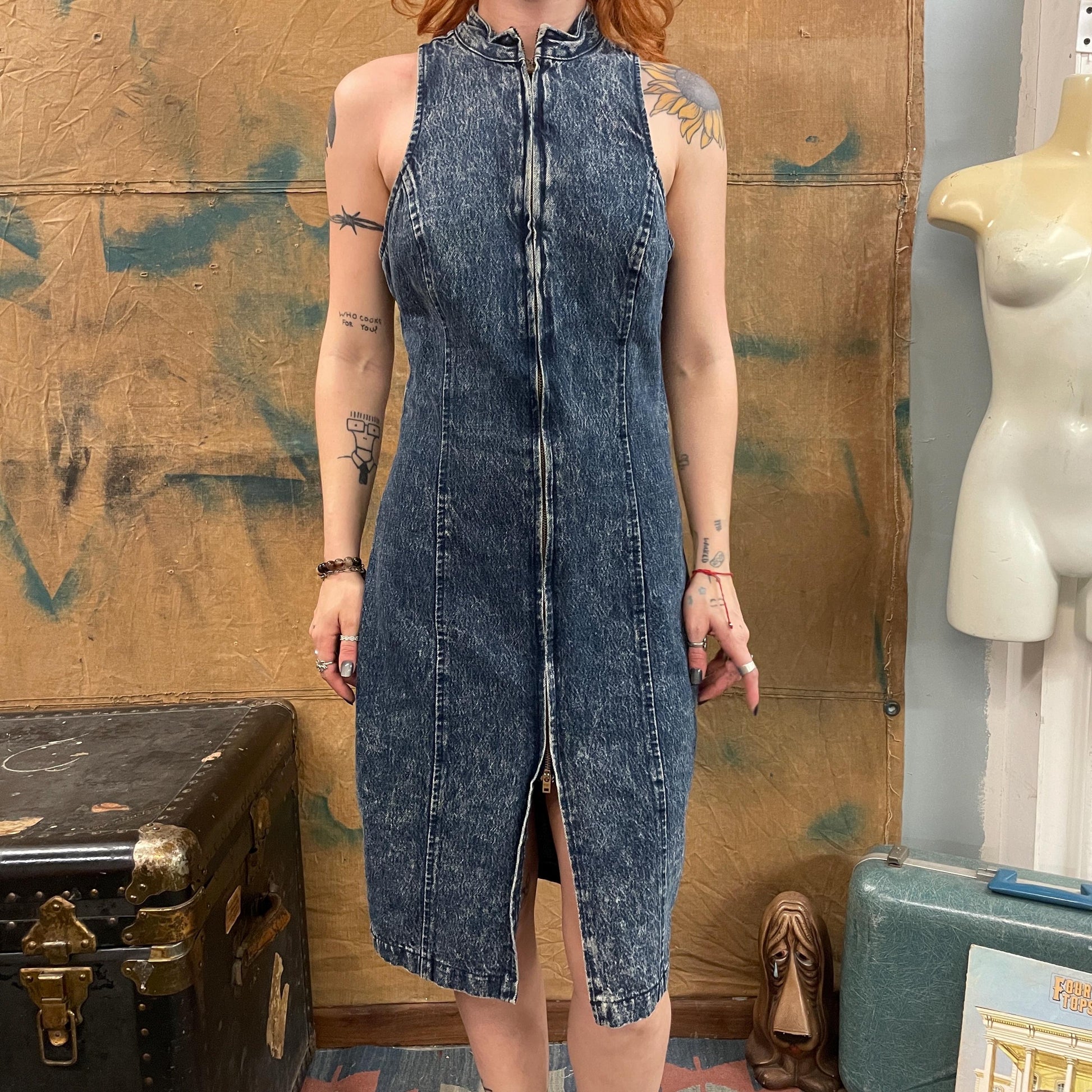 vtg 90s DARK ACID WASH Denim Dress // vintage 80s stone washed jean zip up sexy wiggle dress sleeveless baddie mini skirt rocker punk hot