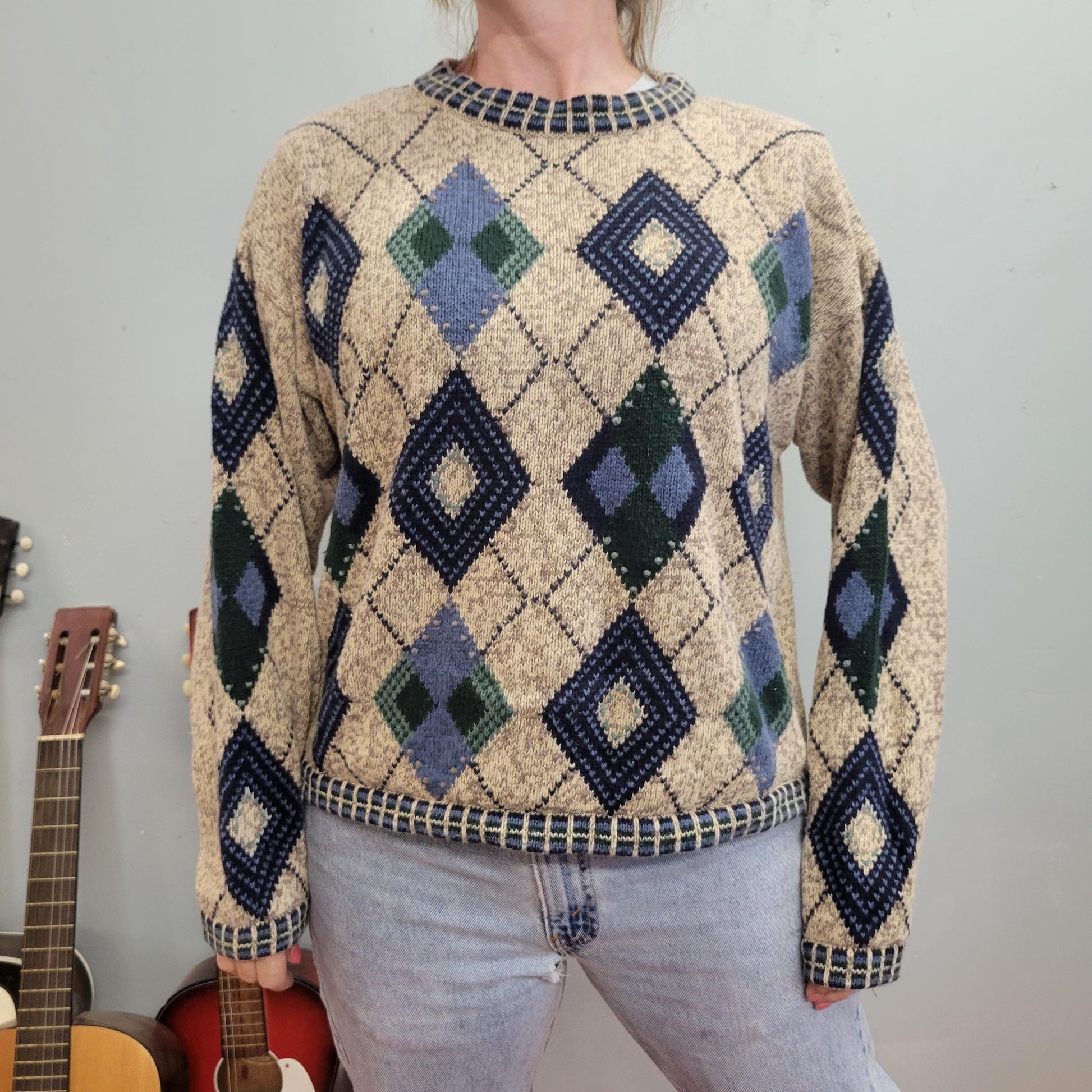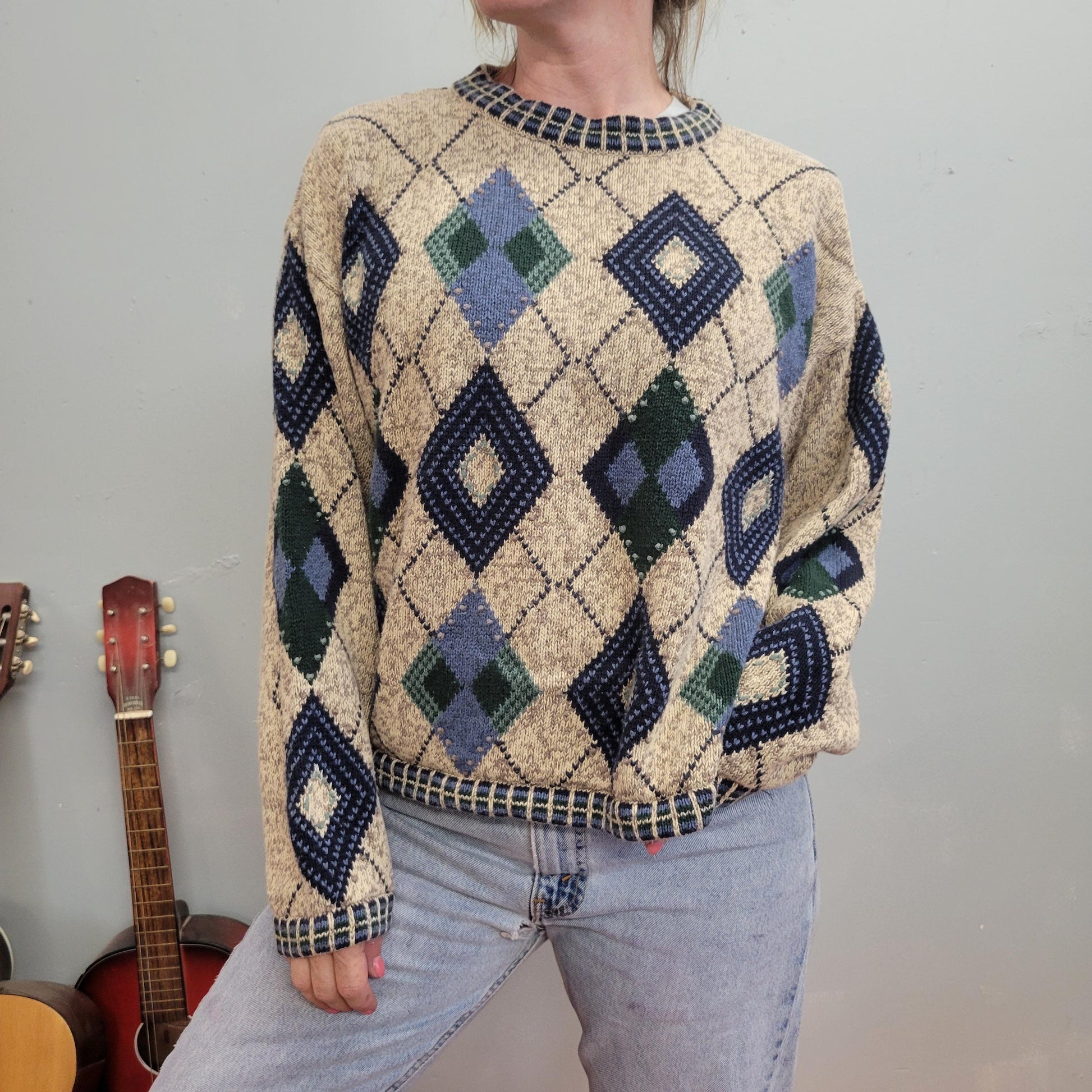 vtg 90s DIAMOND PRINT SWEATER // preppy argyle cable knit chunky checkered teacher cottage geometric pattern pullover jumper