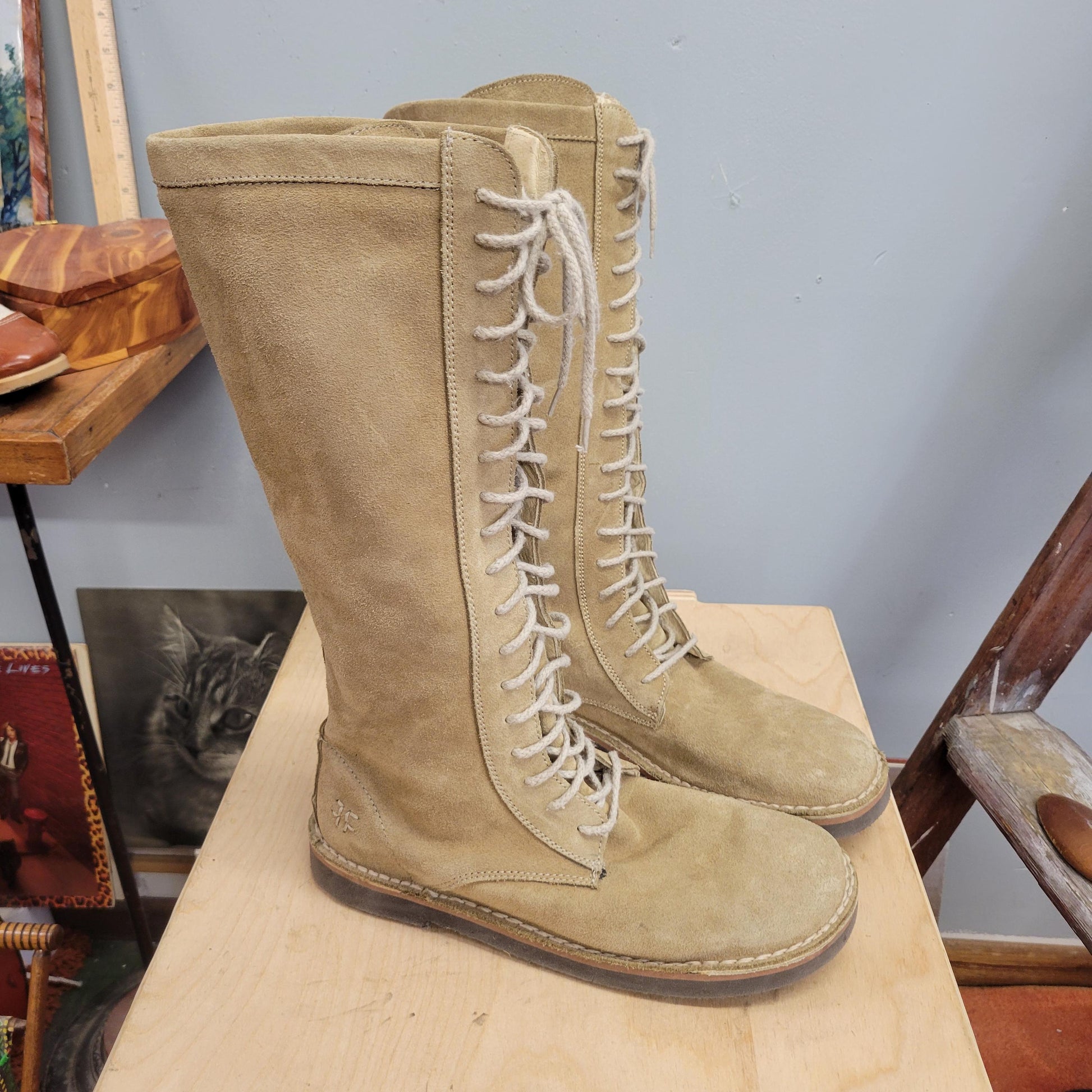 vtg 90s FRYE SUEDE BOOTS// vintage size 10 womens leather uggs style knee high lace up moccasin style hippie autumn winter fashion calf high