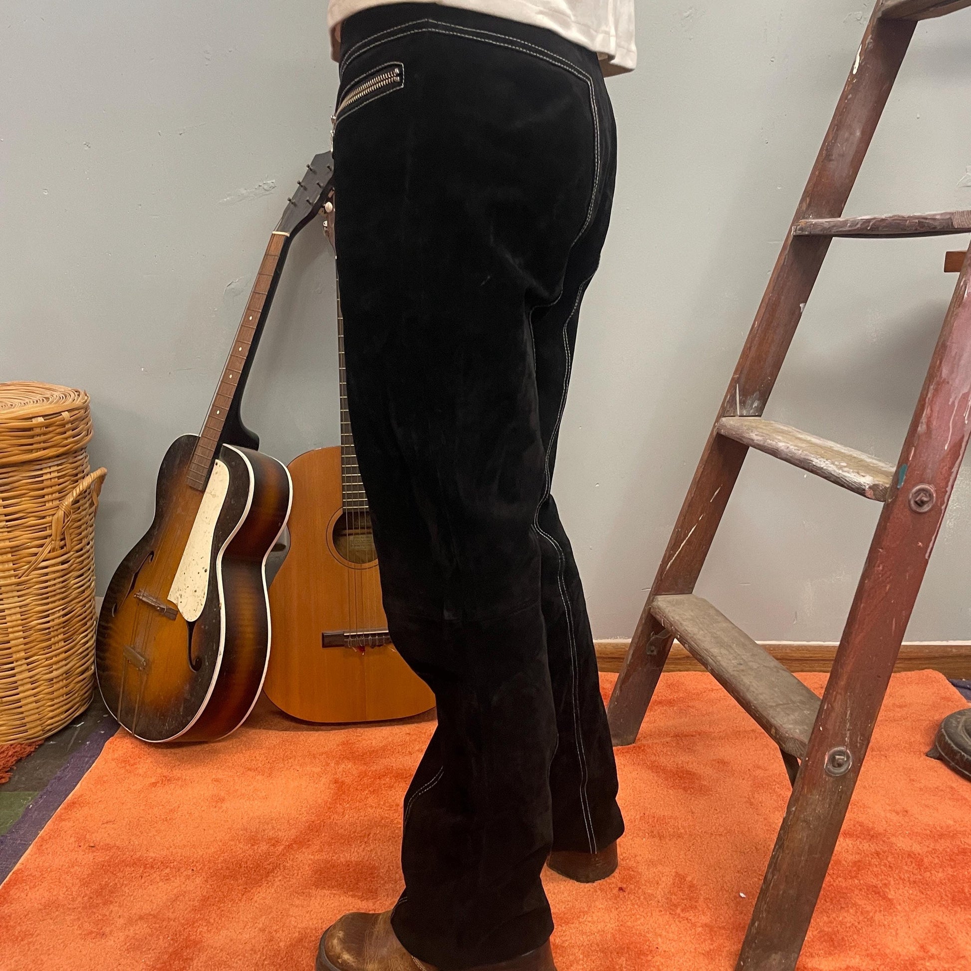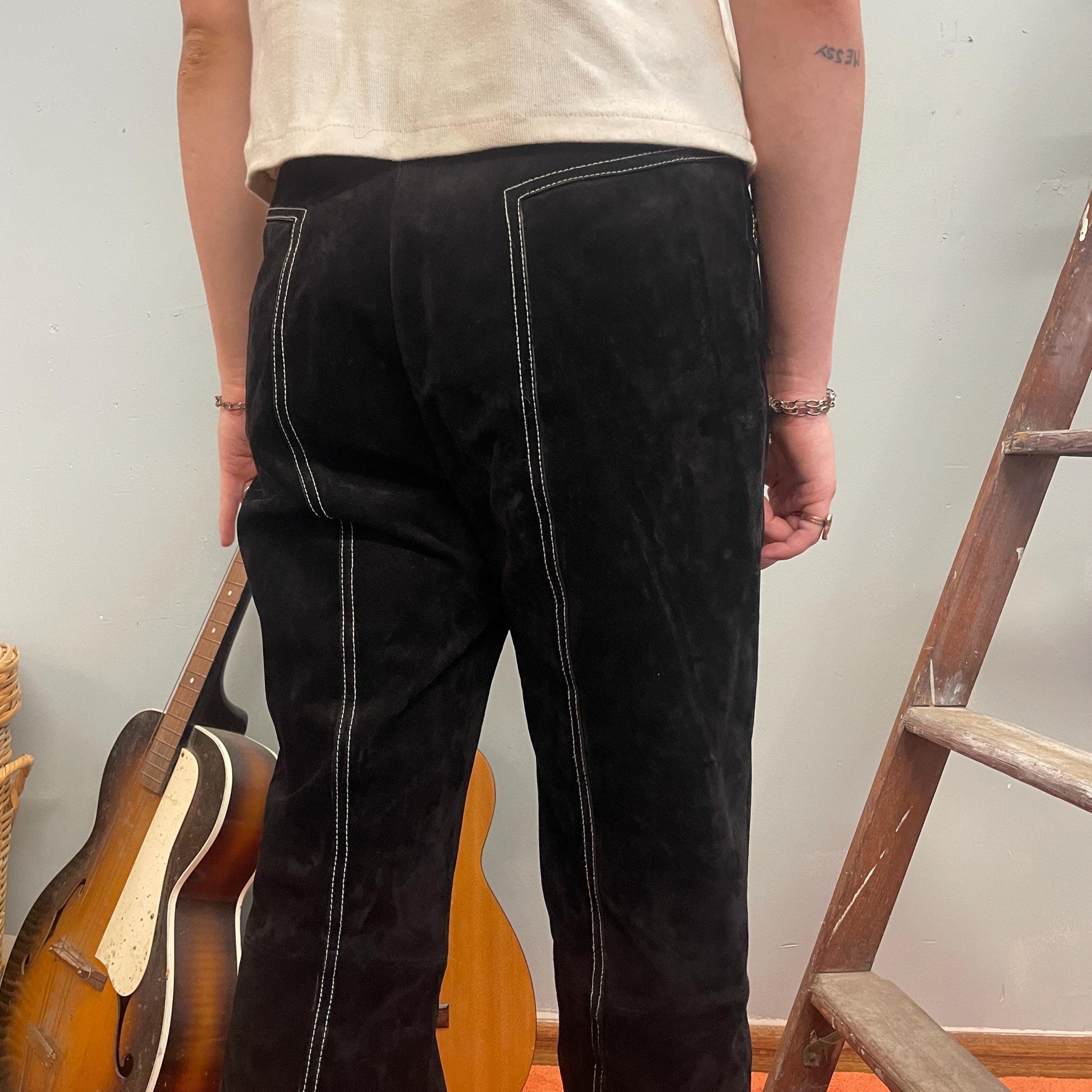 vtg 90s LEATHER ZIPPER PANTS // vintage y2k suede black white contrast stitch bareback biker rocker straight leg bootcut western hippie