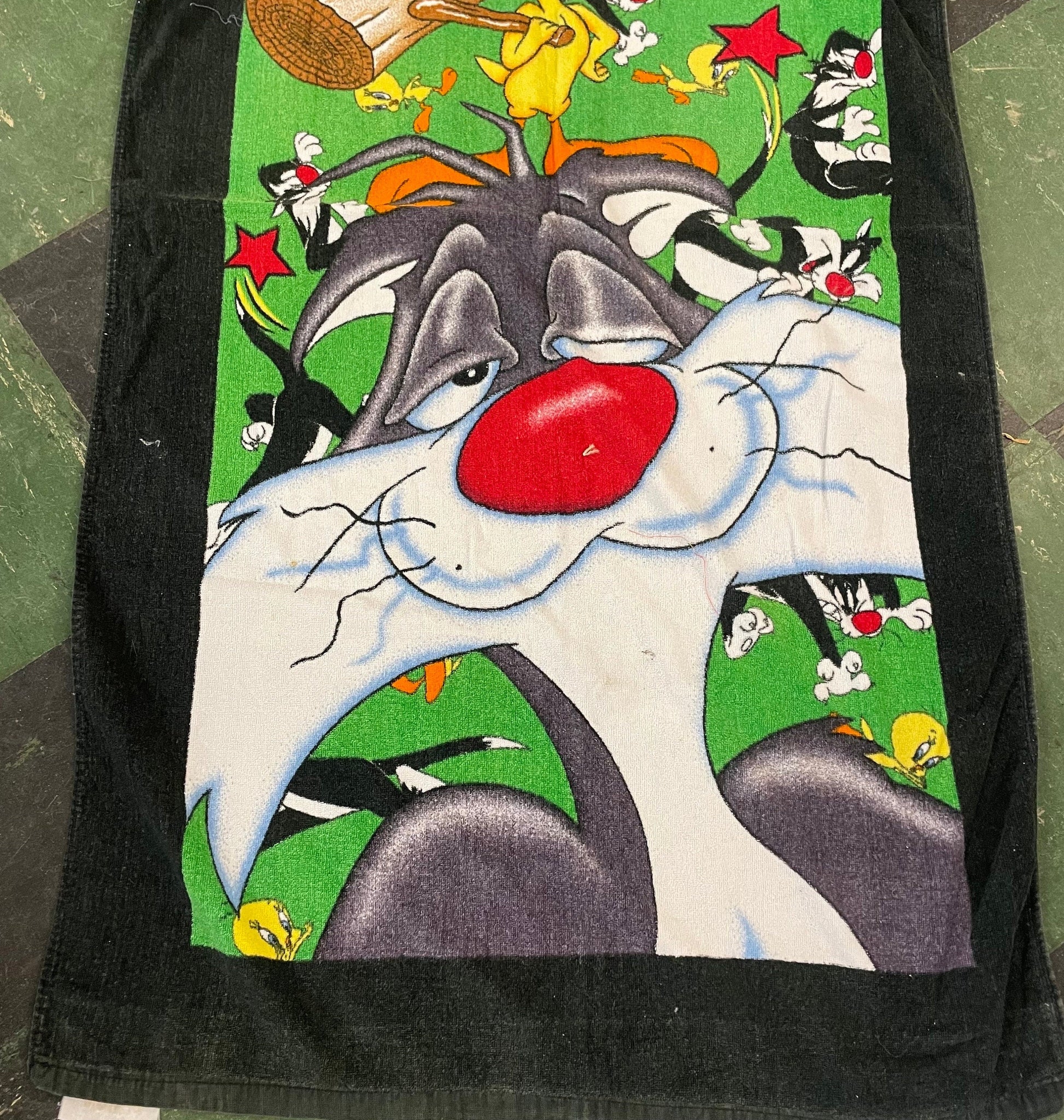 vtg 90s Looney Tunes Tweety & Sylvester cartoon plush terrycloth beach towel bright vivid funny summer lake Y2K swimsuit pool beach outfit