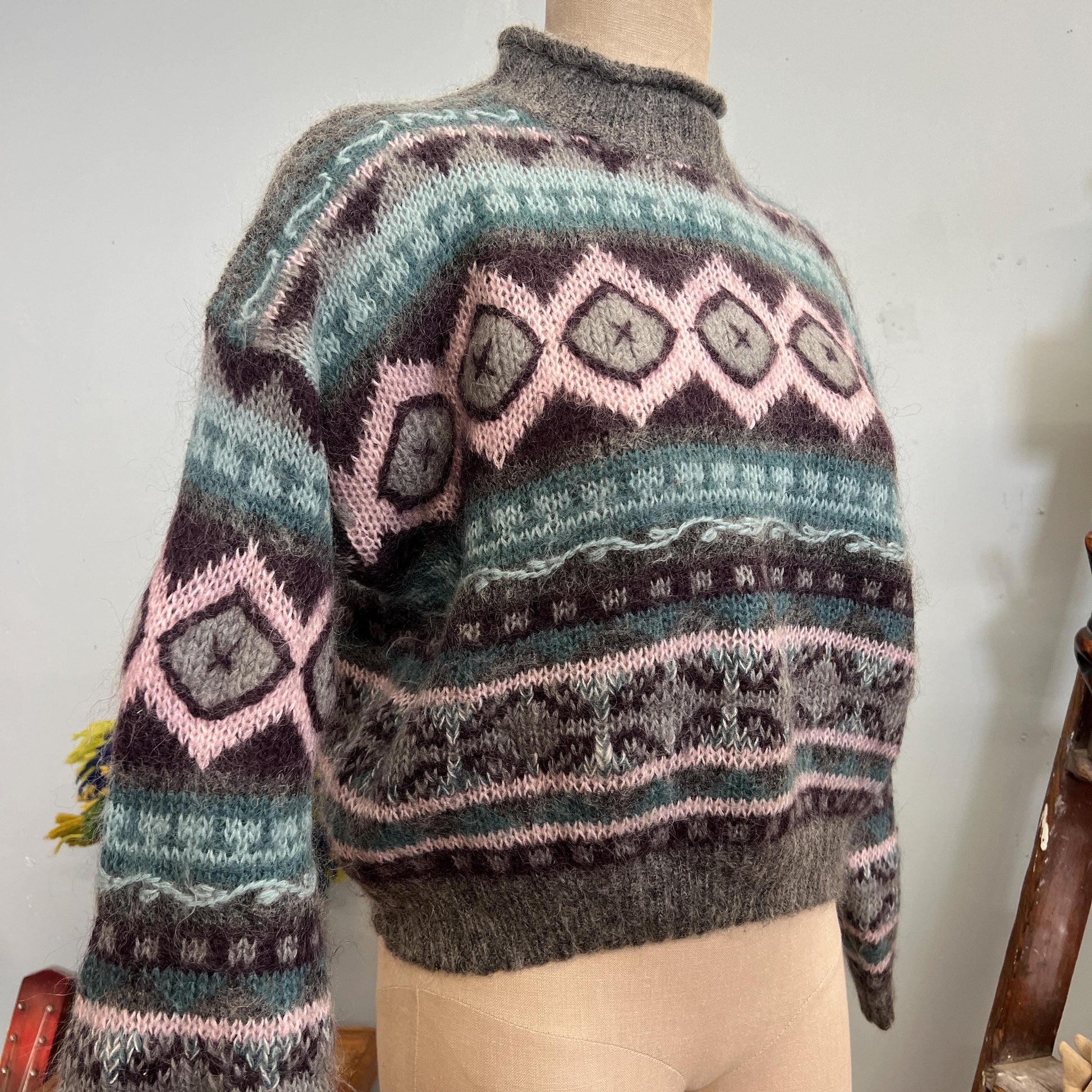 vtg 90s PATTERNED MOHAIR SWEATER // vintage Christopher & banks large geometric shaggy boxy knitwear striped pastel neutral tones preppy