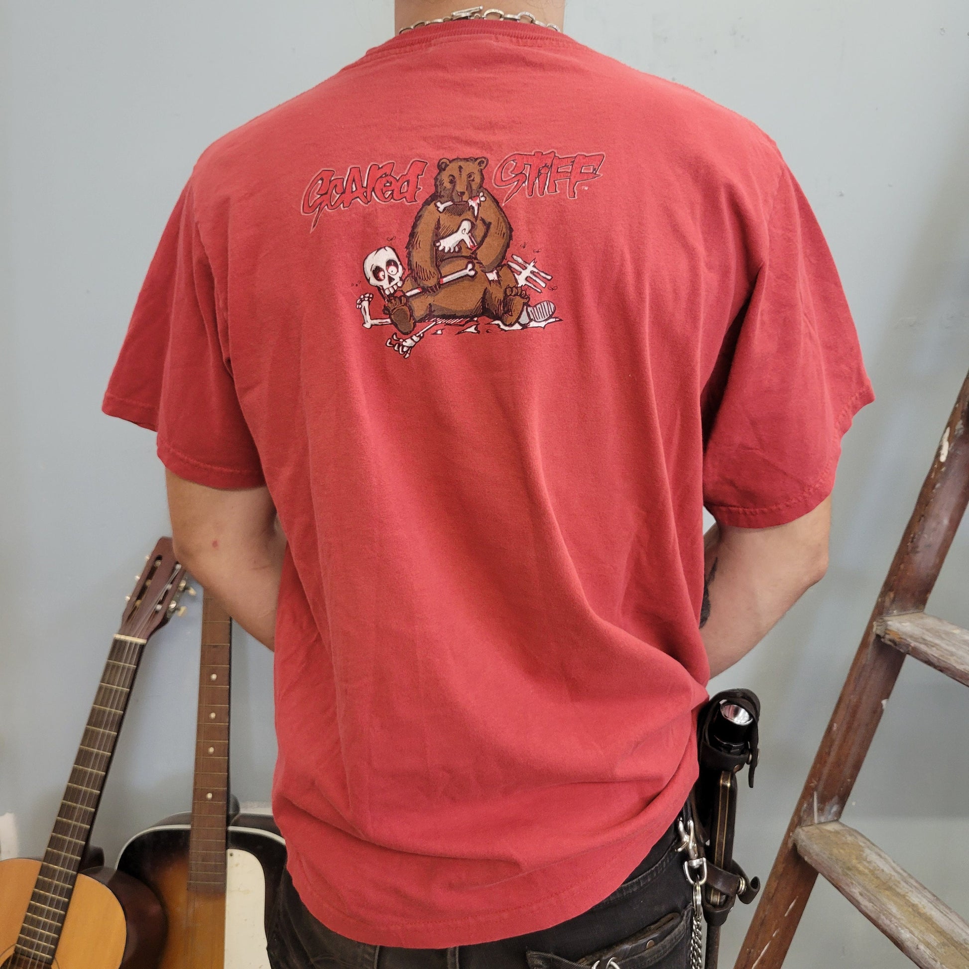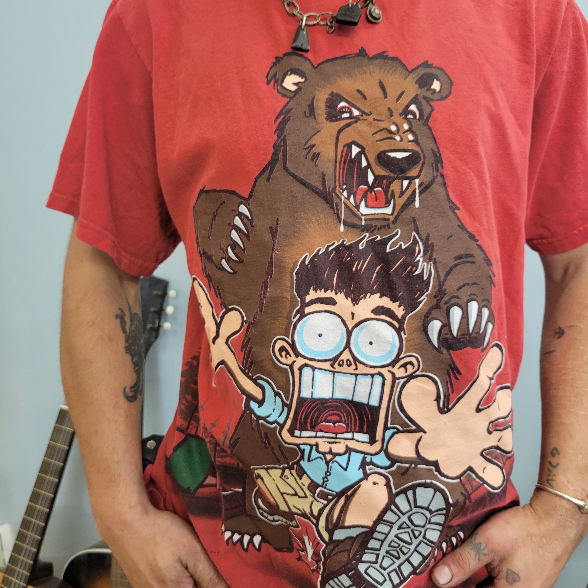vtg 90s SCARED STIFF TSHIRT // vintage bear camp tent woods skater comic aop cartoon meme outdoors tourist crude maroon grunge punk tour