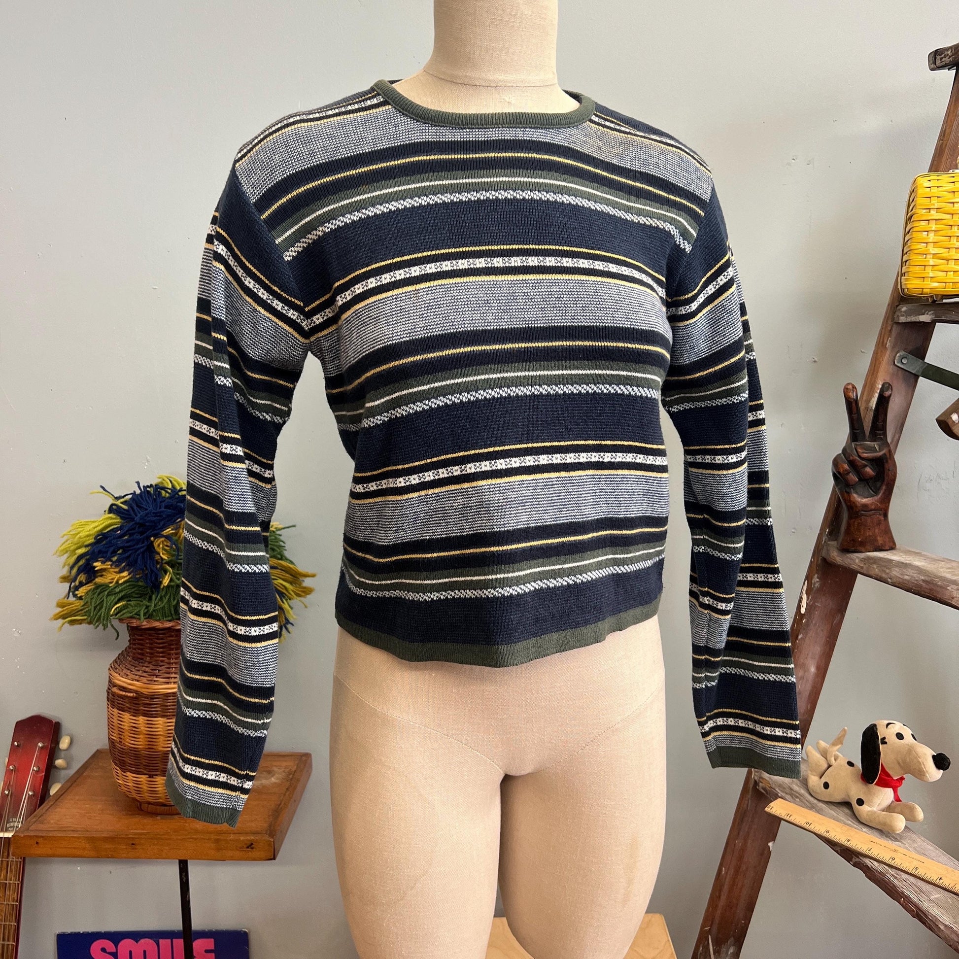 vtg 90s STRIPED CROPPED SWEATER // vintage absolutely by creative cotton medium ribbed knit cute blue yellow striped Y2K 90s girly grunge