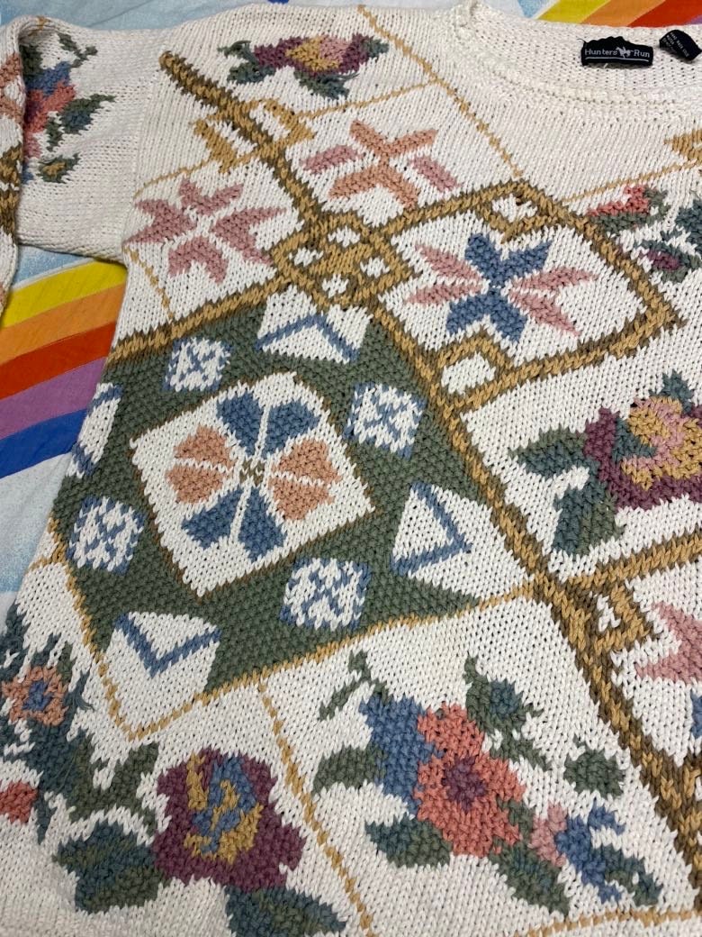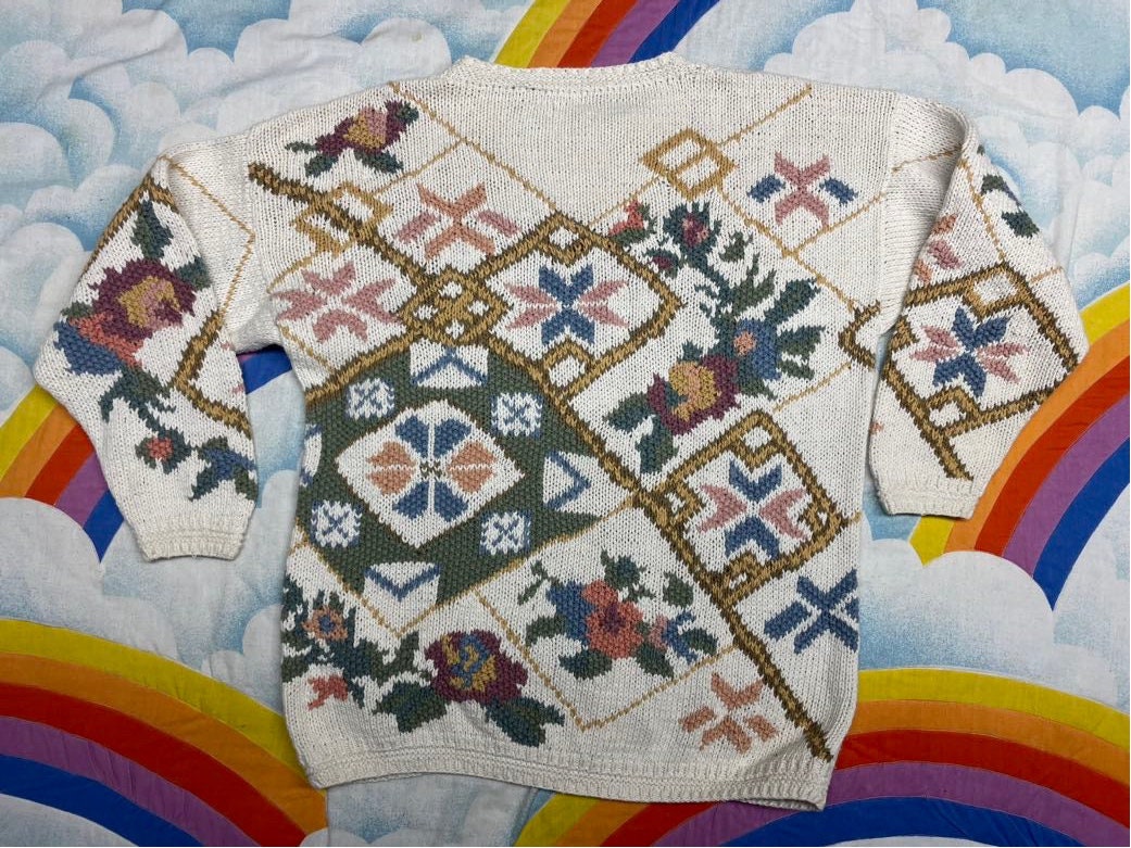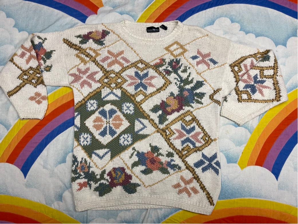 vtg 90s WHITE EMBROIDERED SWEATER // abstract floral kaleidoscope grandma style thick novelty knit boxy school casual neutral color cozy top