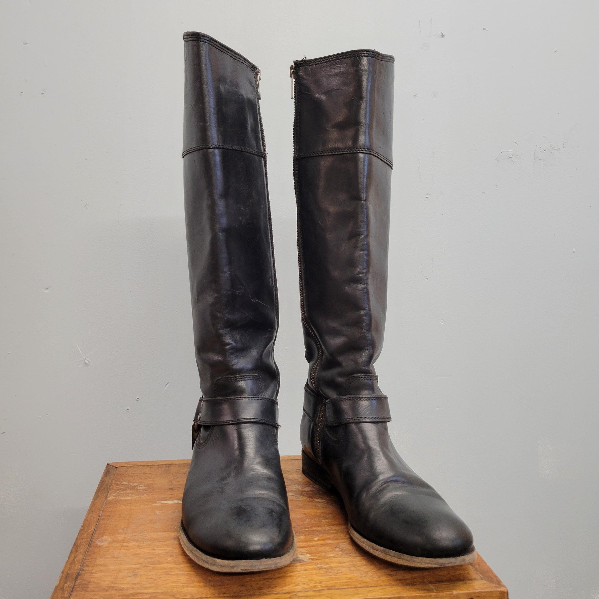 vtg FRYE 'MELISSA HARNESS' Boots // vintage black leather extended calf inside zip boot size 8B knee high mod hippie biker autumn winter