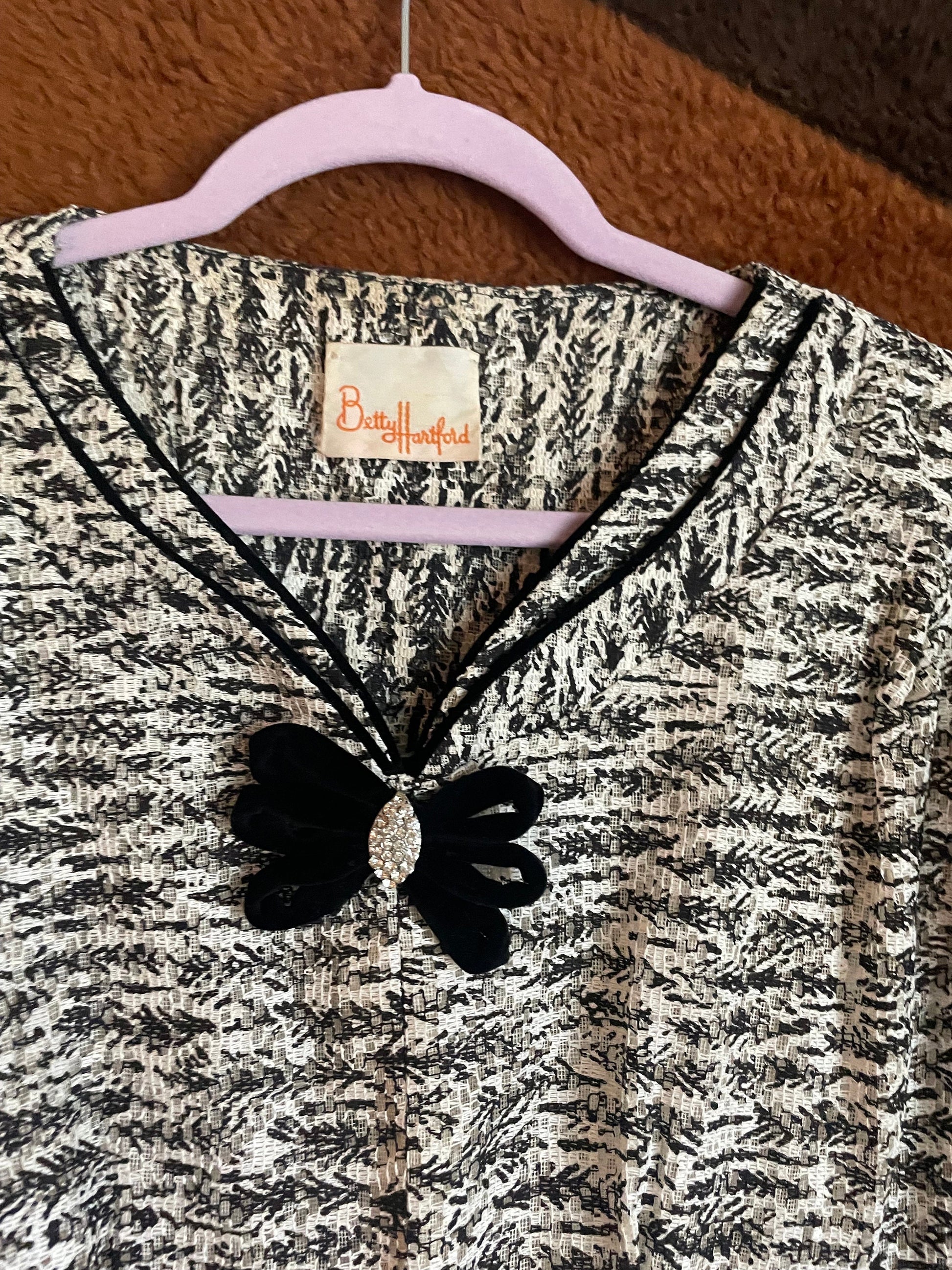vtg late 40s 50s black & white eyelet net dress velvet trim rhinestone bow tie lace fit flare full skirt rockabilly betty draper day dress