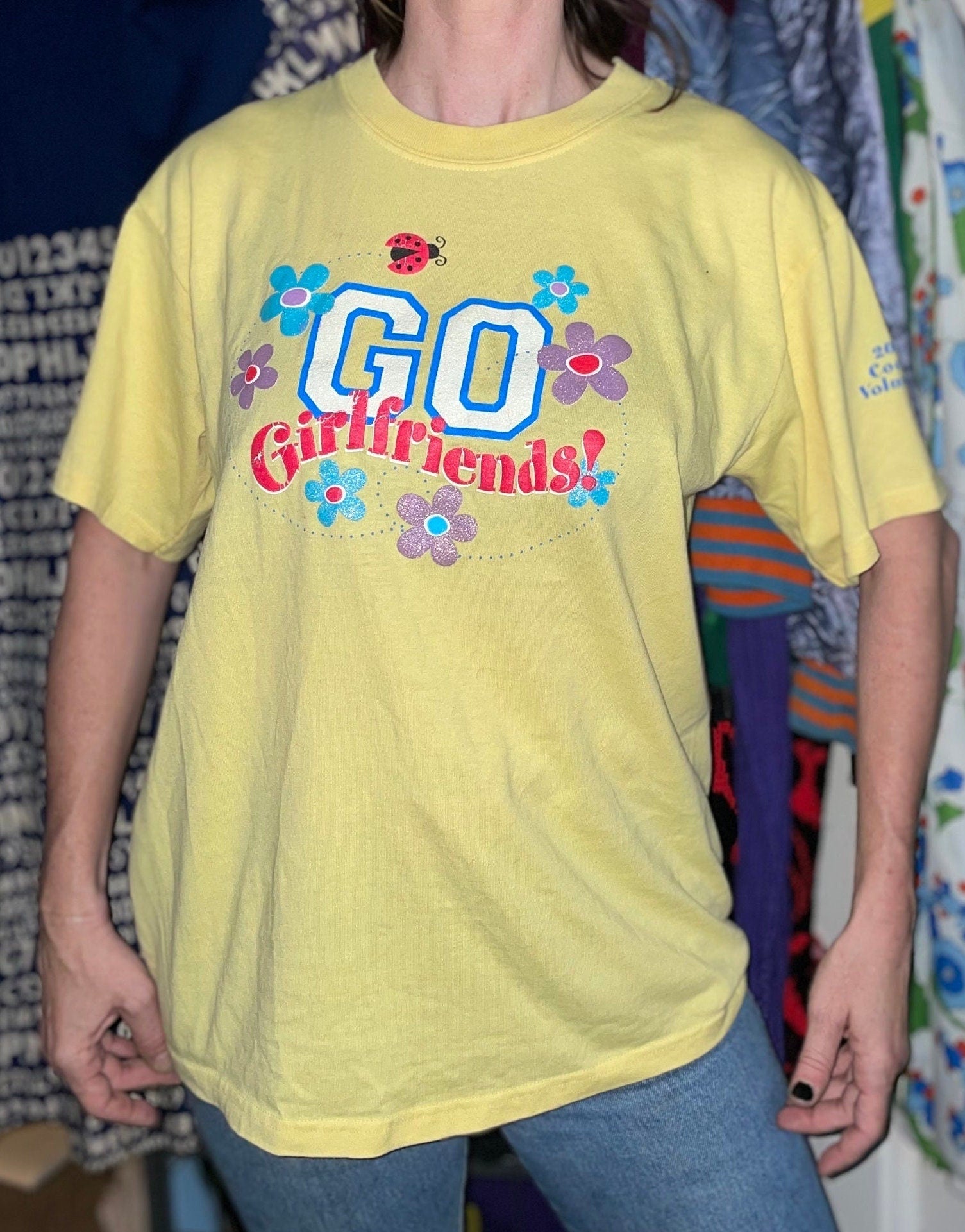 Vintage Y2K Go Girlfriends ! Shirt / 90s Flower Power Shirt / Puff Paint Iron On Shirt / Pastel Yellow Shirt