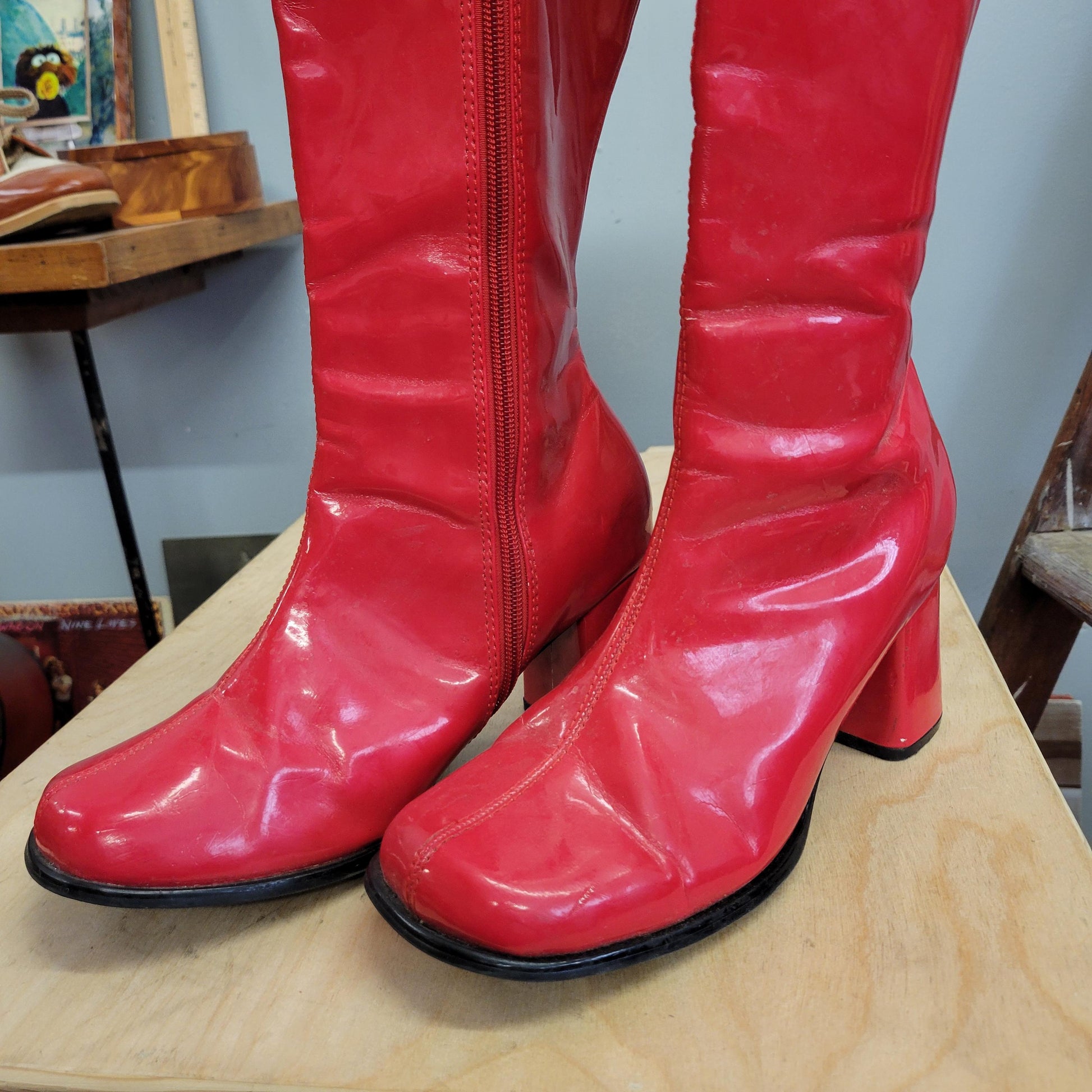 vtg Y2K LEATHER SANTA BOOTS // vintage sexy heels christmas mrs clause costume knee highs fur trim vinyl holiday party cosplay kinky boots