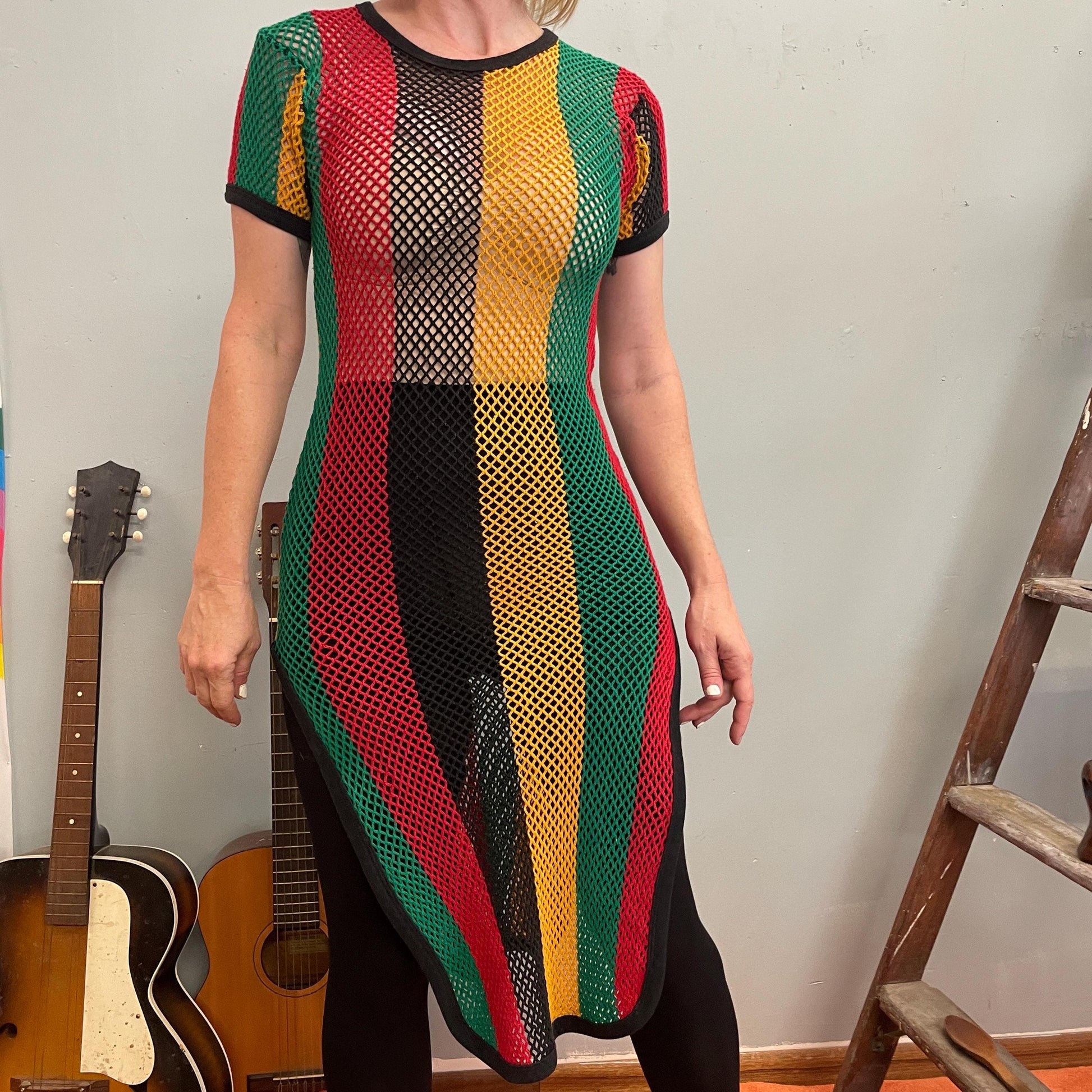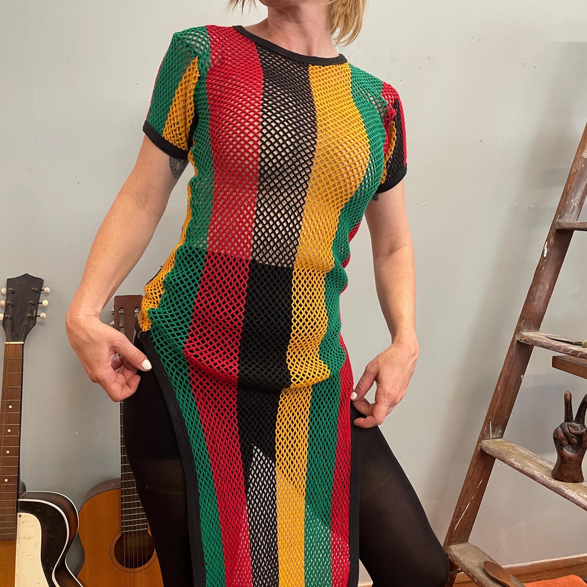 vtg Y2K RAGGAE CROCHET DRESS // 90s mesh beach cover up striped knit sexy Rasta hippie stoner see through maxi retro soccer sporty style