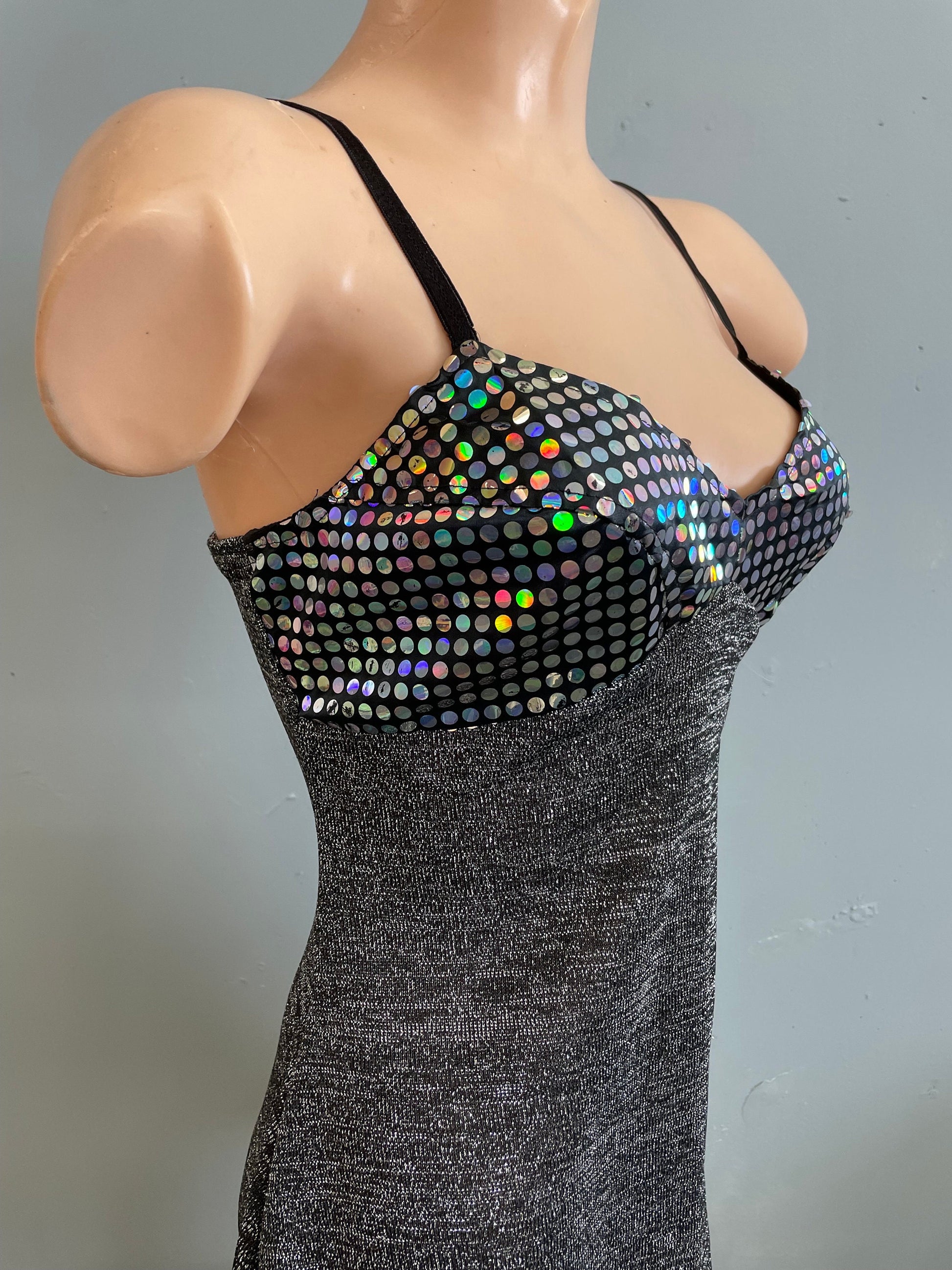 Vtg Y2K silver holographic sequin dress bustier slinky rave party clubbing tank dress mini a line low cut bralette summer festival dress hot